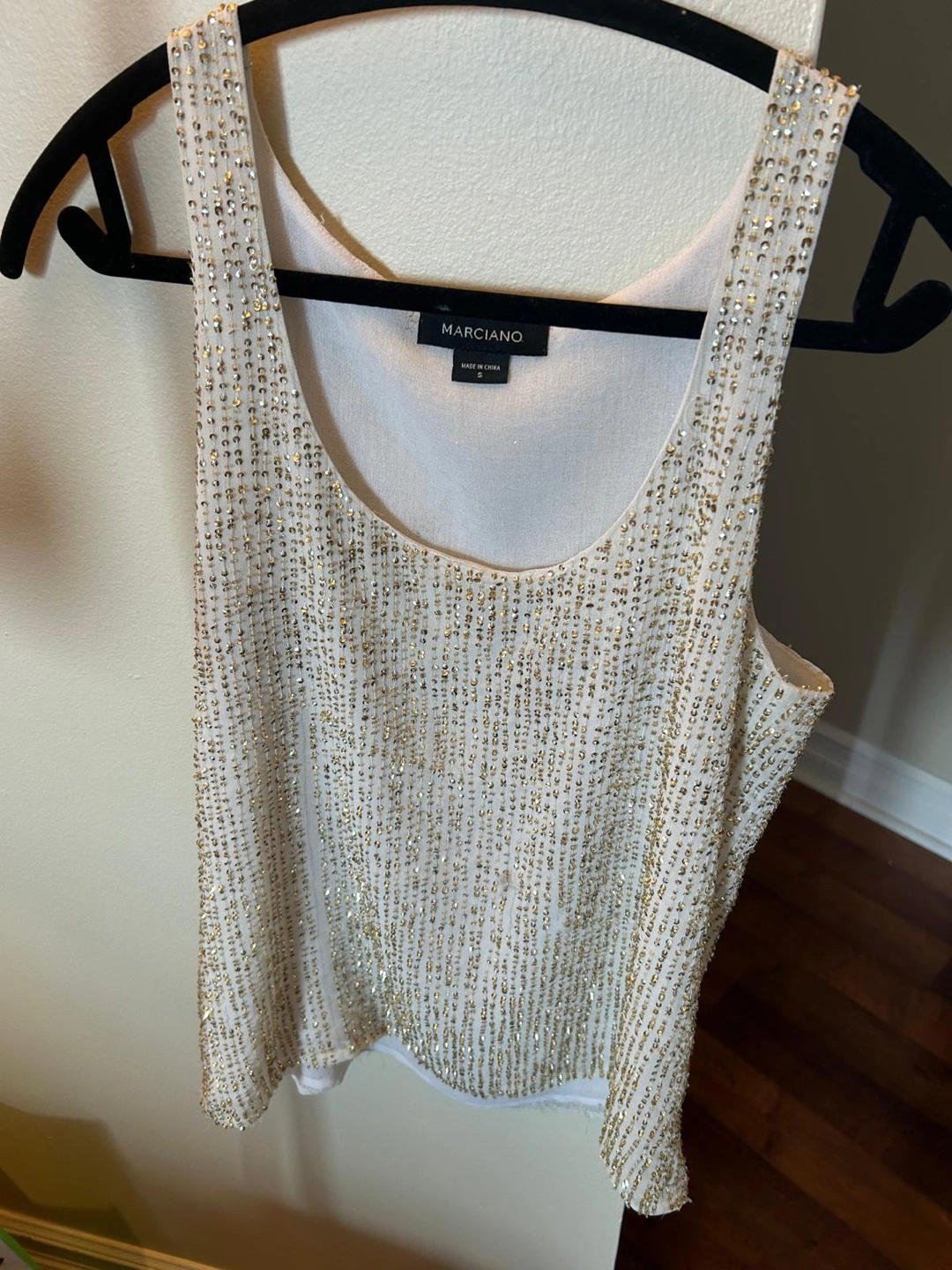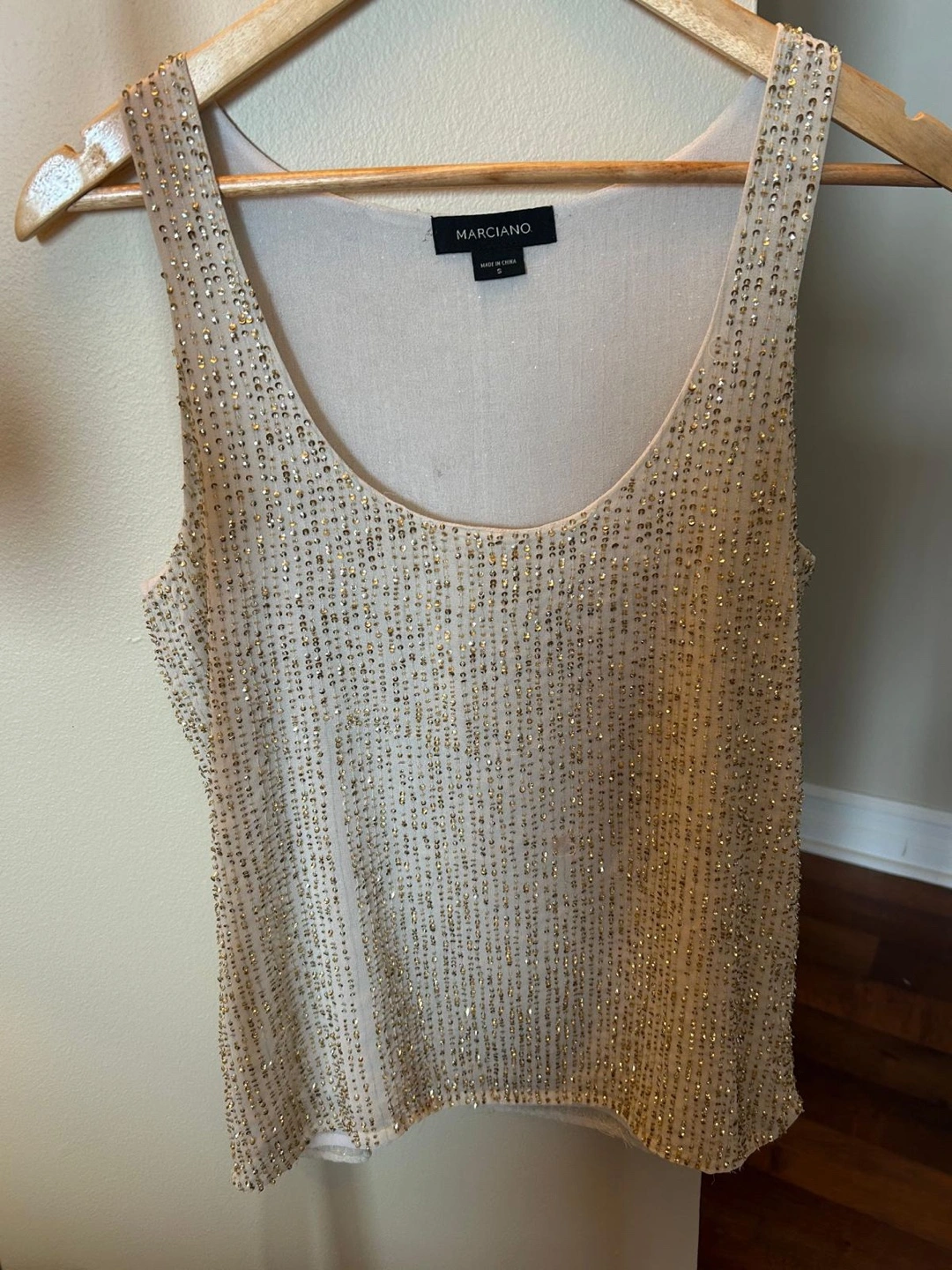 10Here's a lovely Marciano sleeveless top in size small! It's a beautiful neutral colour with sparkly details, perfect for dressing up or down. In great condition and ready for a new home