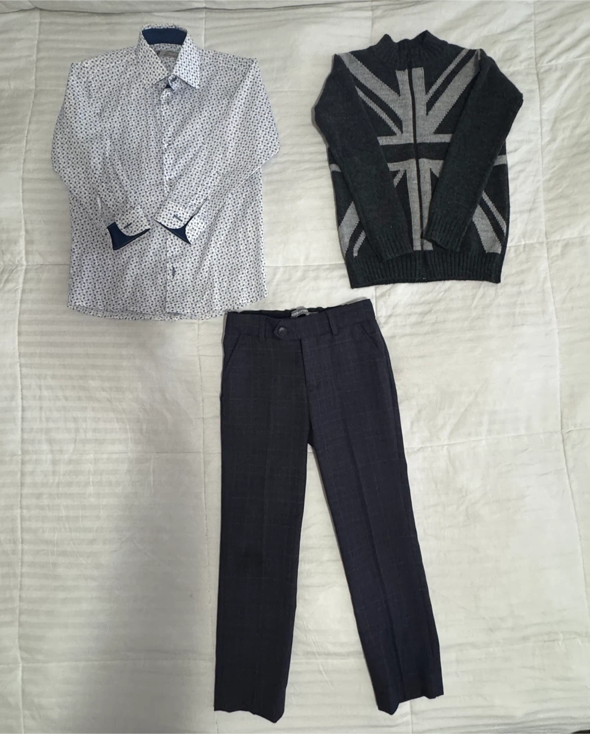 The shirt is made with fabric from Italy and features a cute paisley pattern Perfect for any occasion! Comes with grey / blue checkered dress pants and a warm cardigan.
