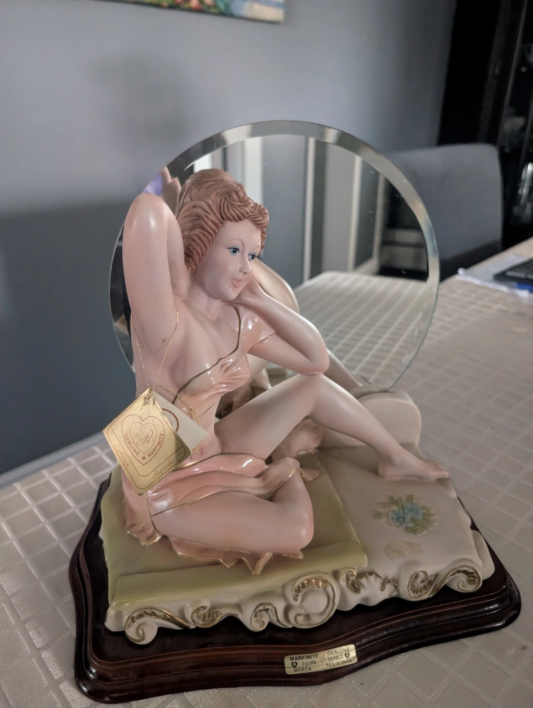 20Beautiful porcelain figurine. Woman seated before a mirror. Intricate details. Collectible piece. Excellent condition.