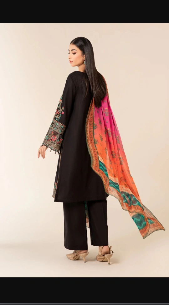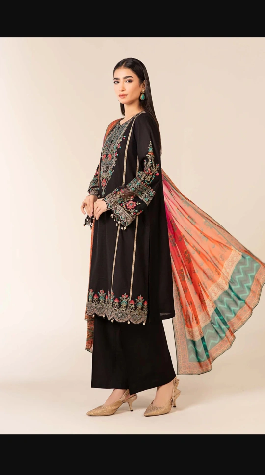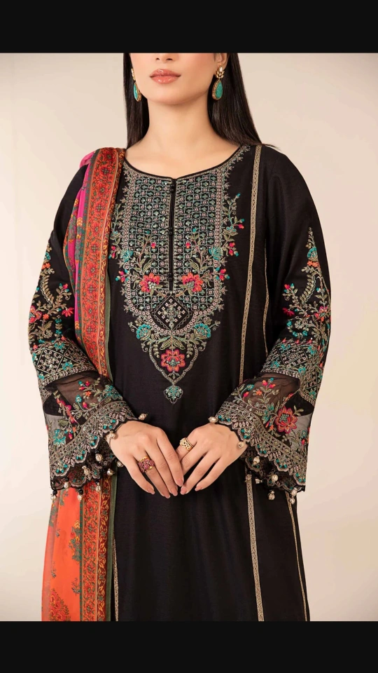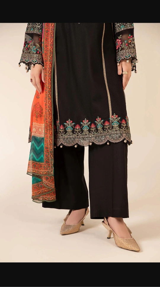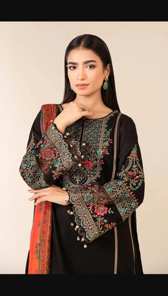 28Beautiful black kameez shalwar outfit with intricate embroidery. Perfect for a special occasion or everyday wear. The outfit includes a kameez (tunic), shalwar (pants), and a dupatta (scarf).