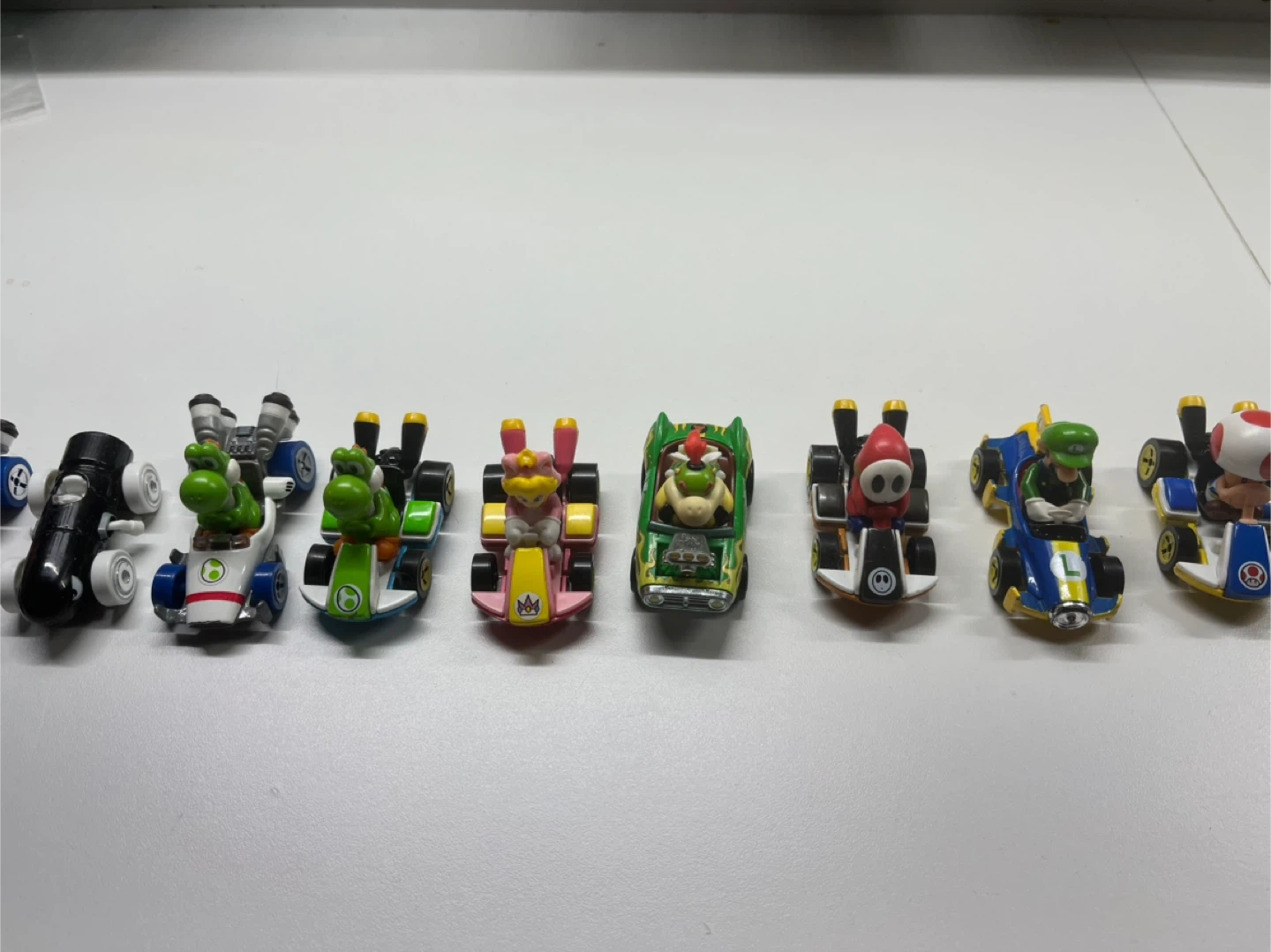 75Selling a complete set of Mario Kart die-cast toy cars! These are perfect for collectors or any Mario Kart fan. All the popular characters are here, including Mario, Luigi, Peach, Bowser, Yoshi, and more!
