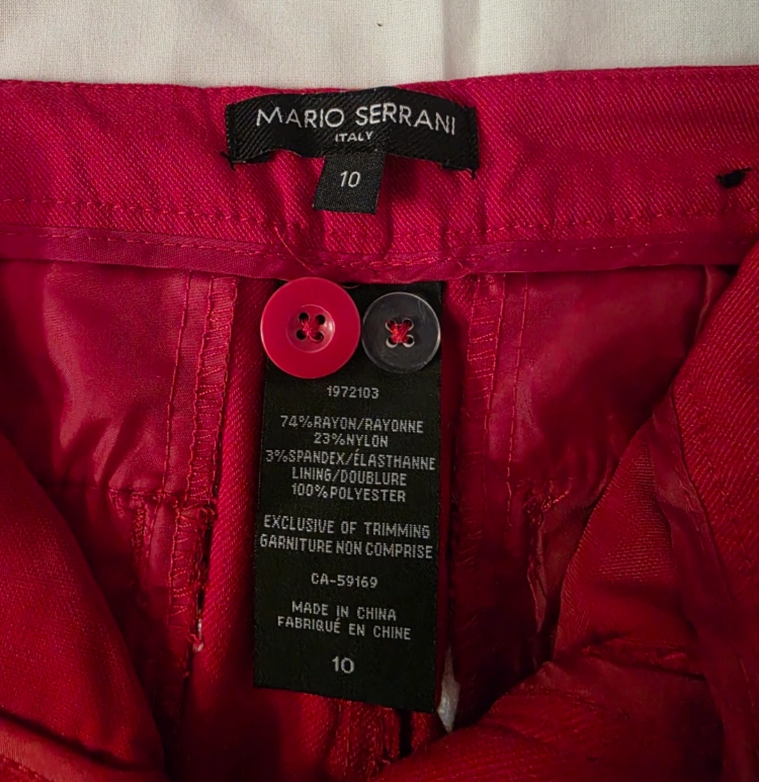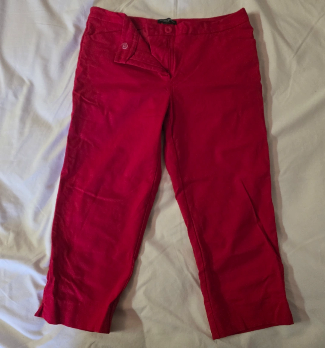86Momma is updating her wardrobe. Mario Serrani capri pants in a vibrant red colour! They're a size 10 and made with a comfortable blend.
