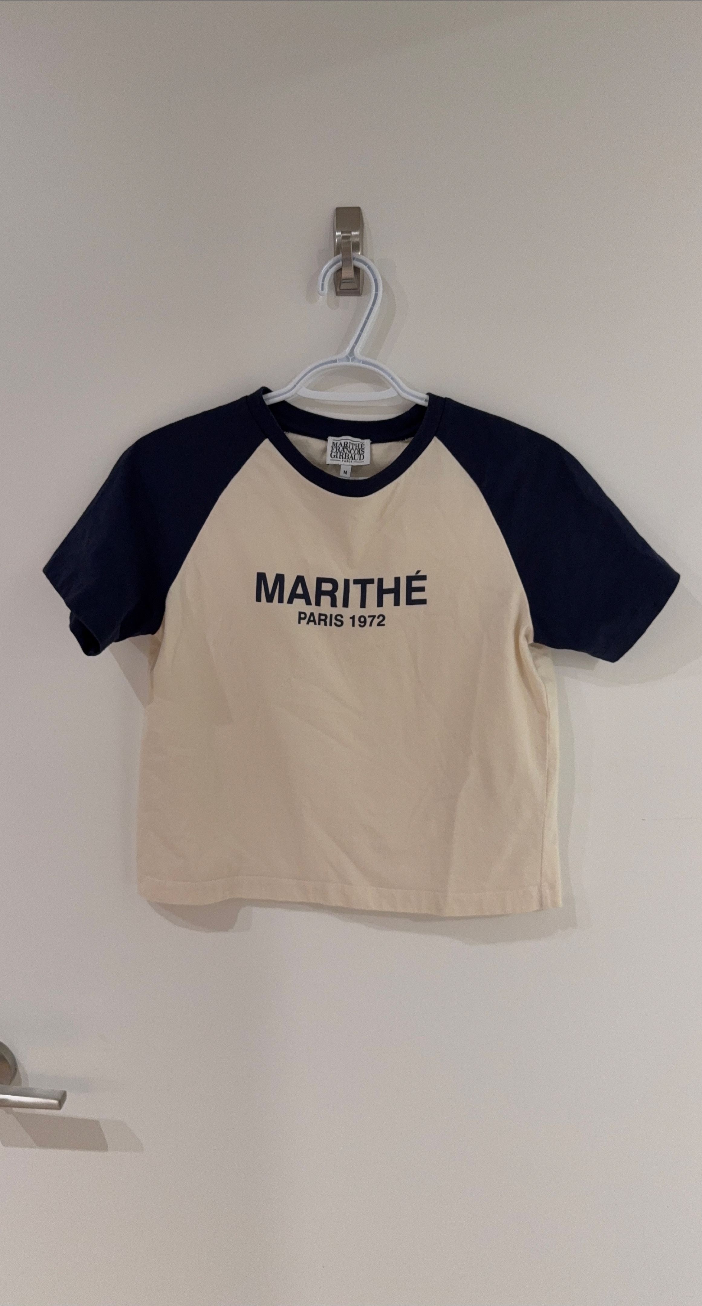 This is a cute Marithe Francois Girbaud T-shirt. It's a size M and features a cream-colored body with navy blue sleeves. Perfect for a casual, stylish look!
