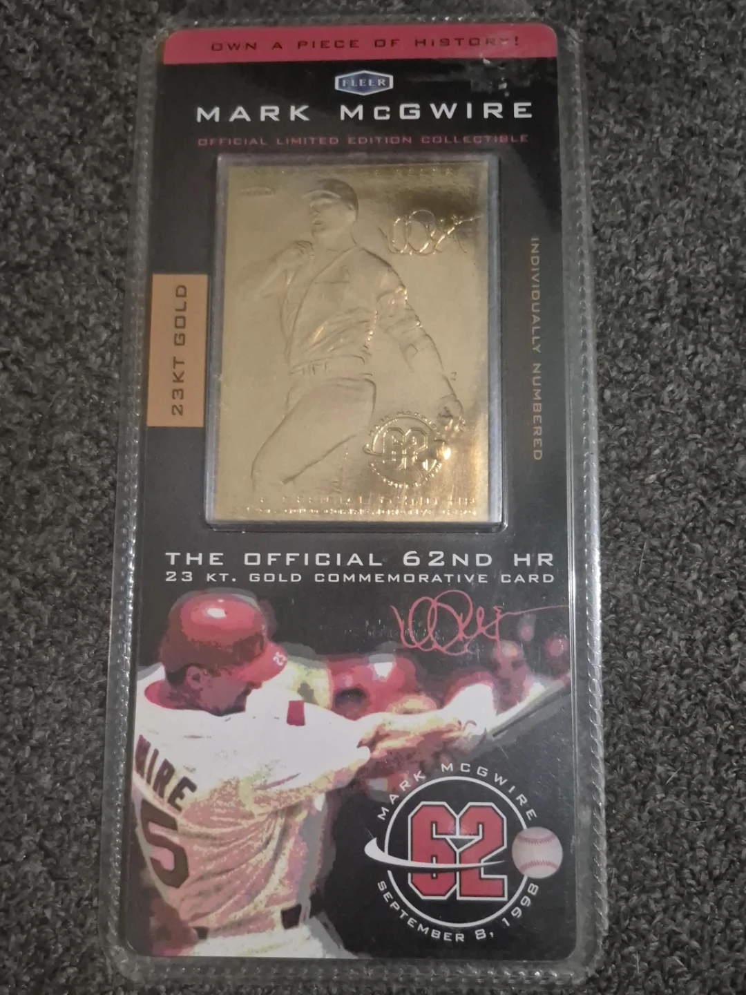 10Own a piece of history with this Mark McGwire official limited edition collectible! This is the official 62nd HR 23kt gold commemorative card, individually numbered and enclosed in an acrylic holder to preserve its prime mint condition. It is made in the U.S.A.