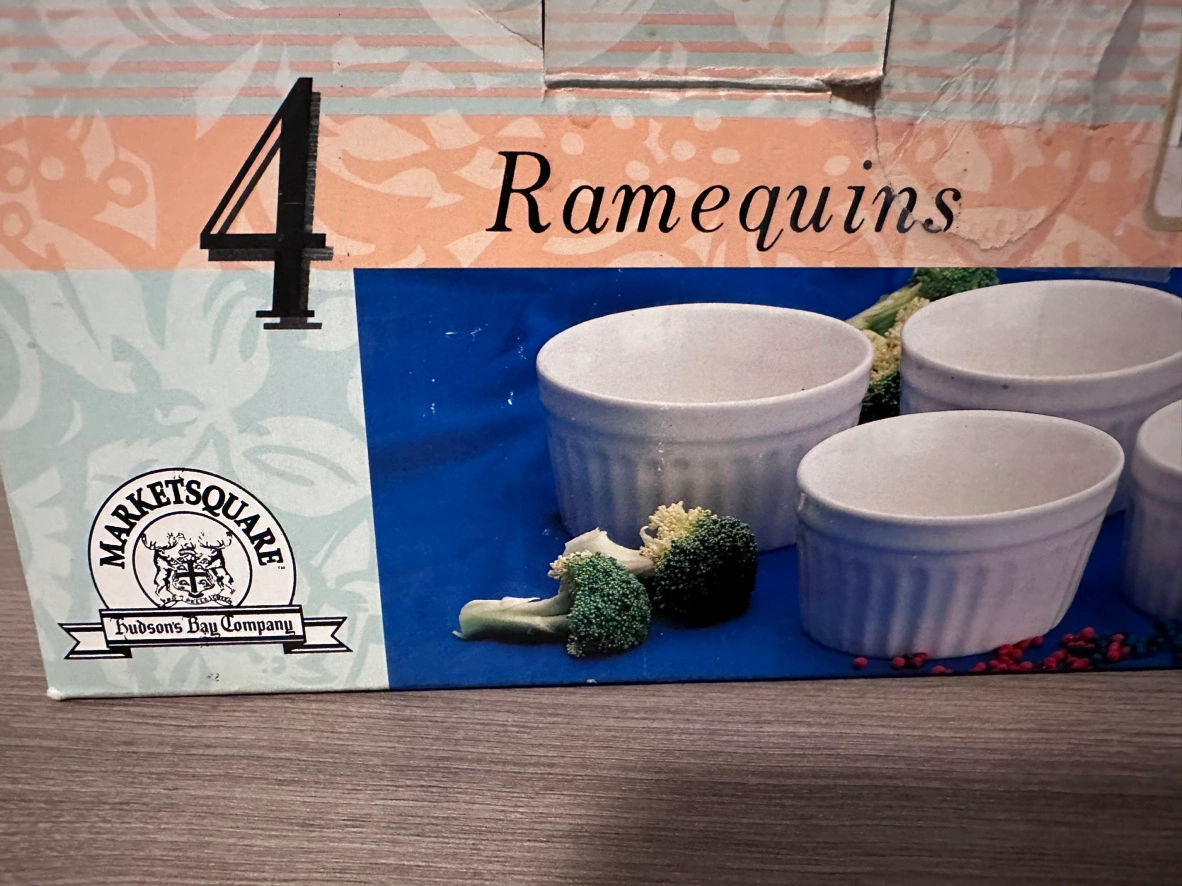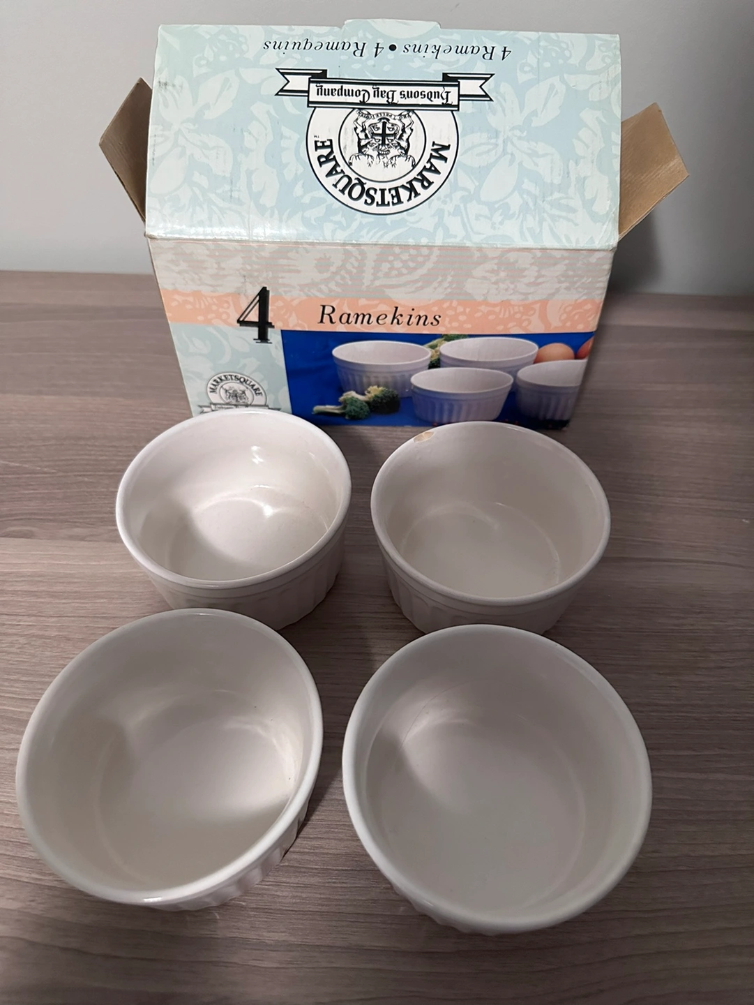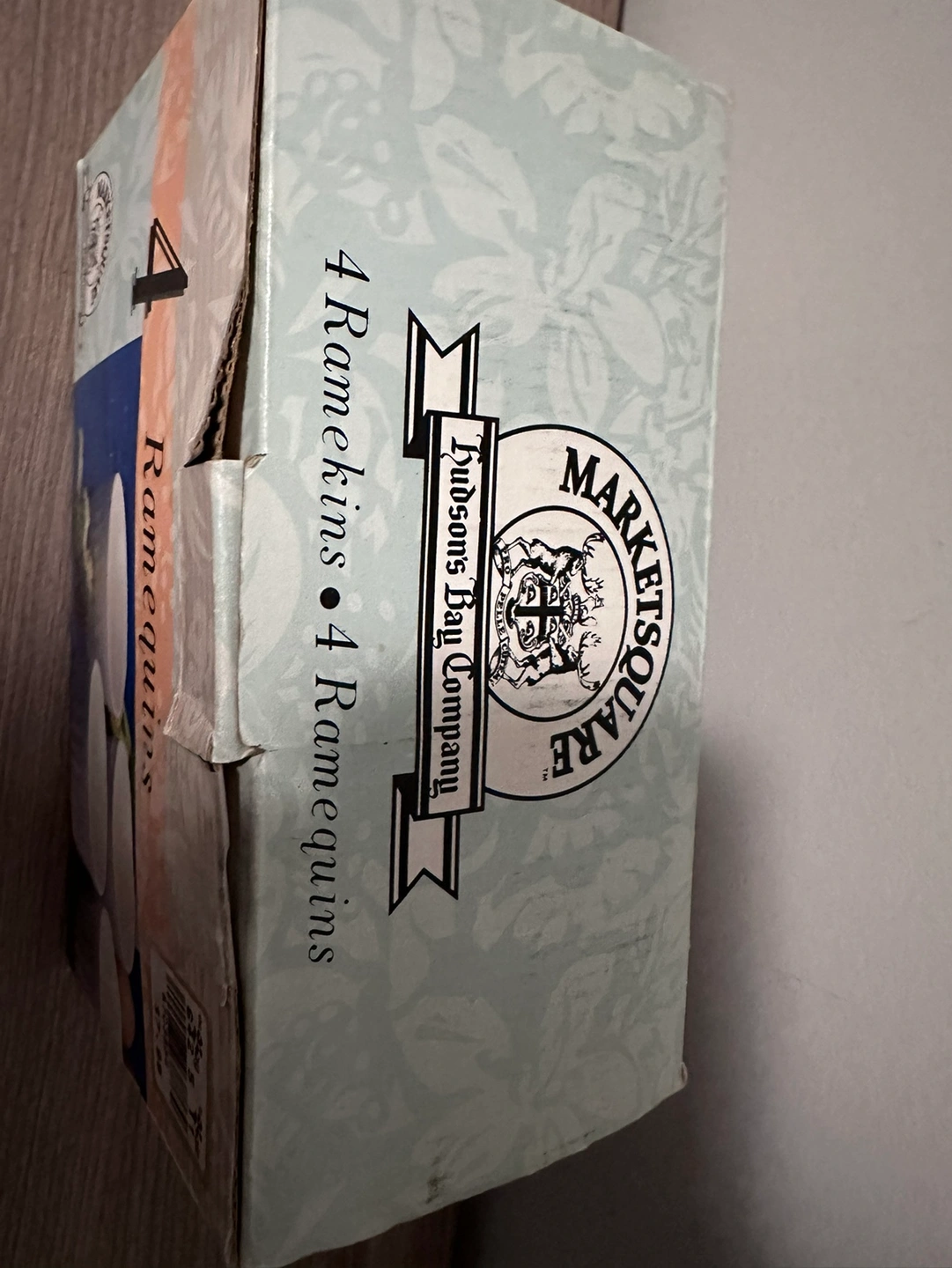Market Square Hudson’s Bay Company 4 Ramekins set , white porcelain, note one ramekin has a chip as shown in photo. Price reflects defect.