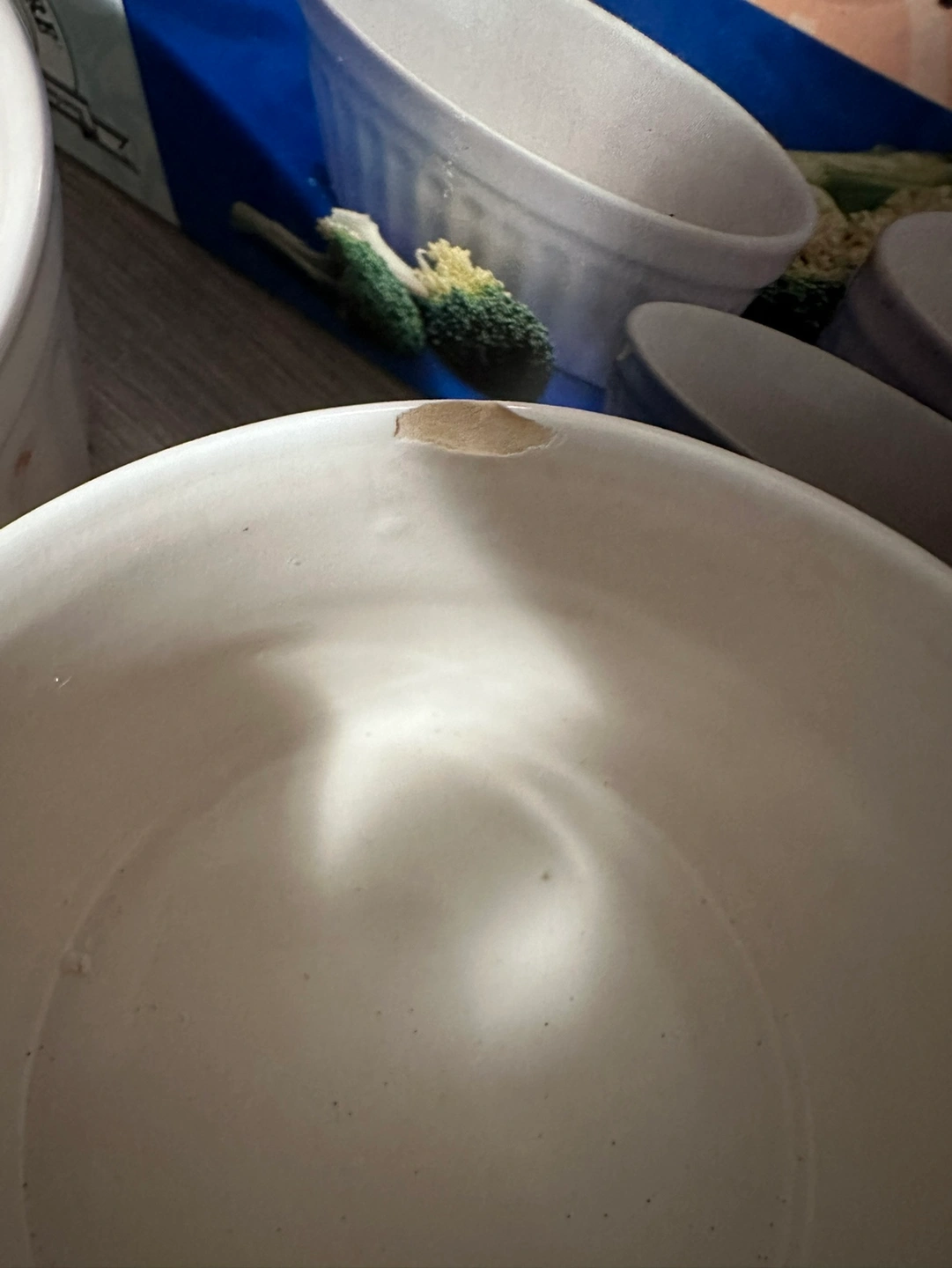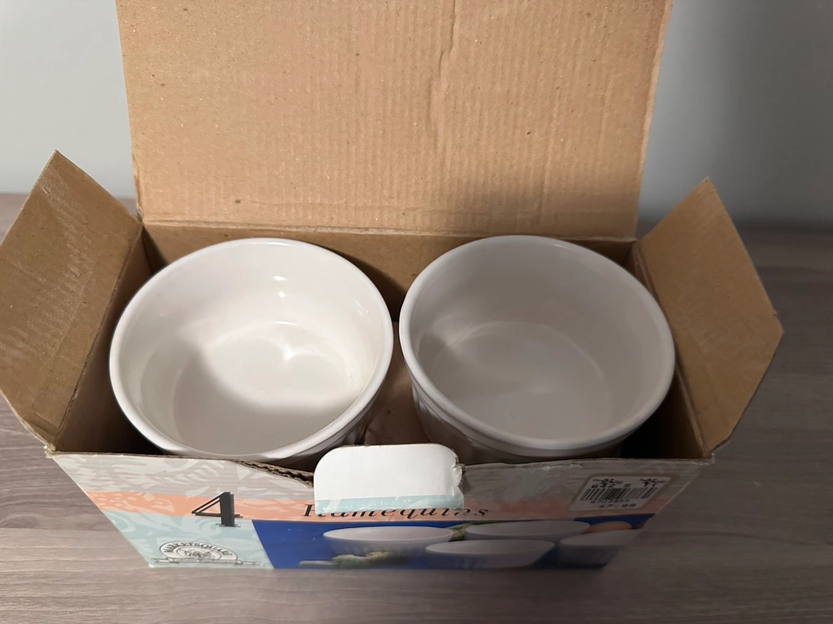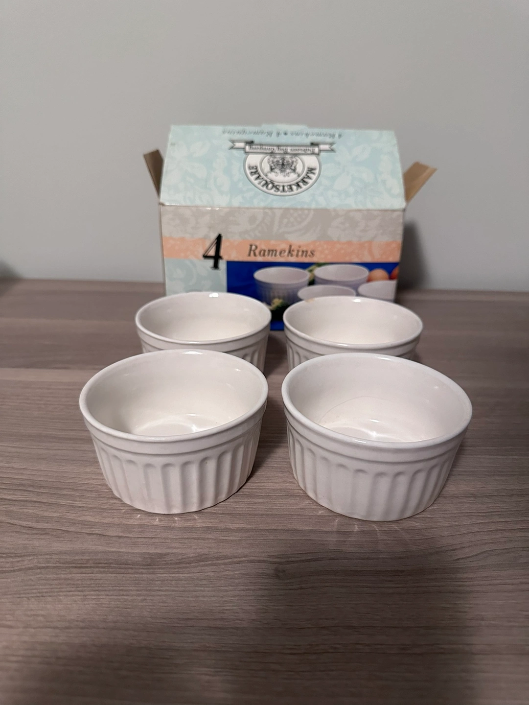 Market Square Hudson’s Bay Company 4 Ramekins set , white porcelain, note one ramekin has a chip as shown in photo. Price reflects defect.