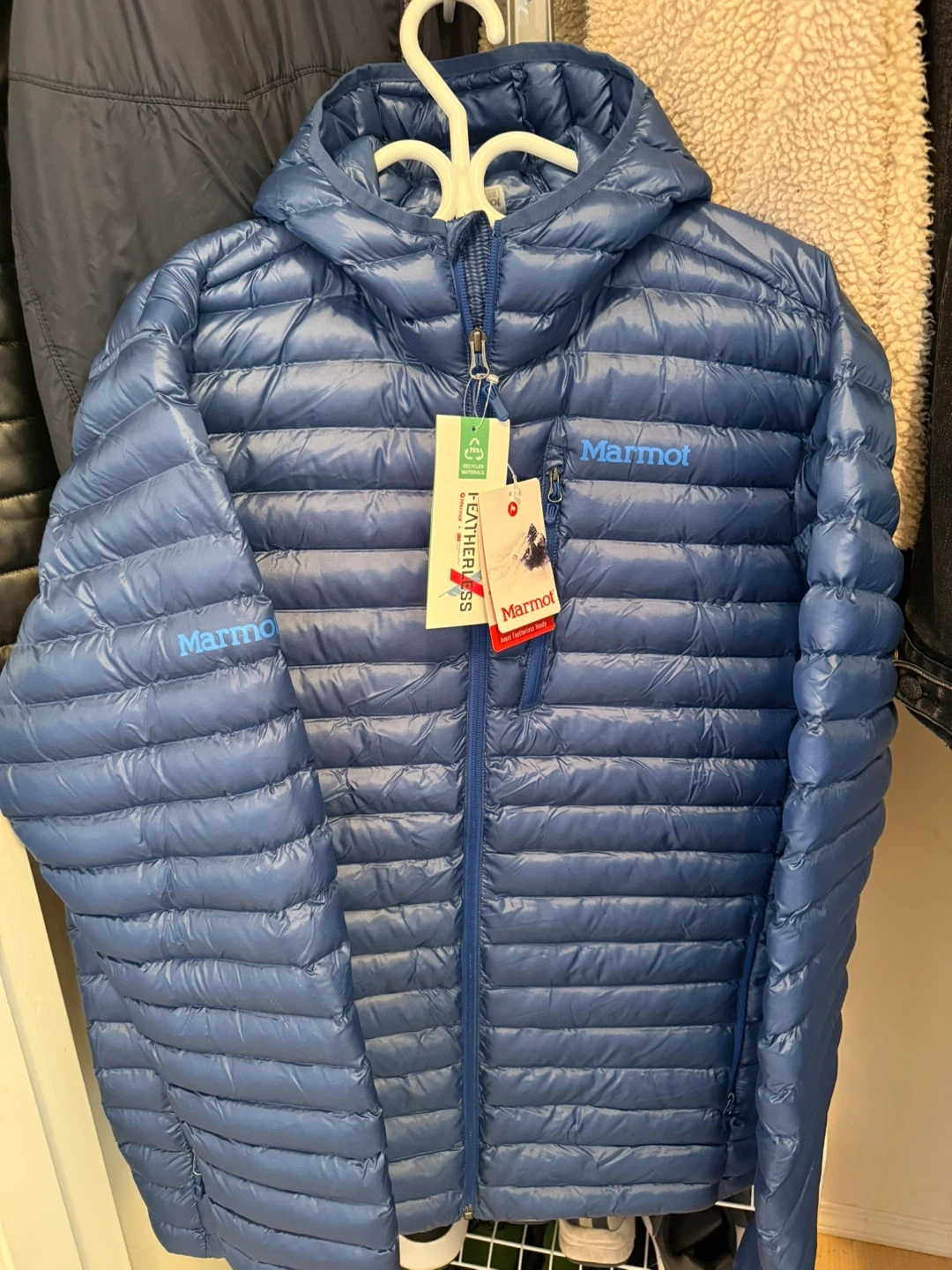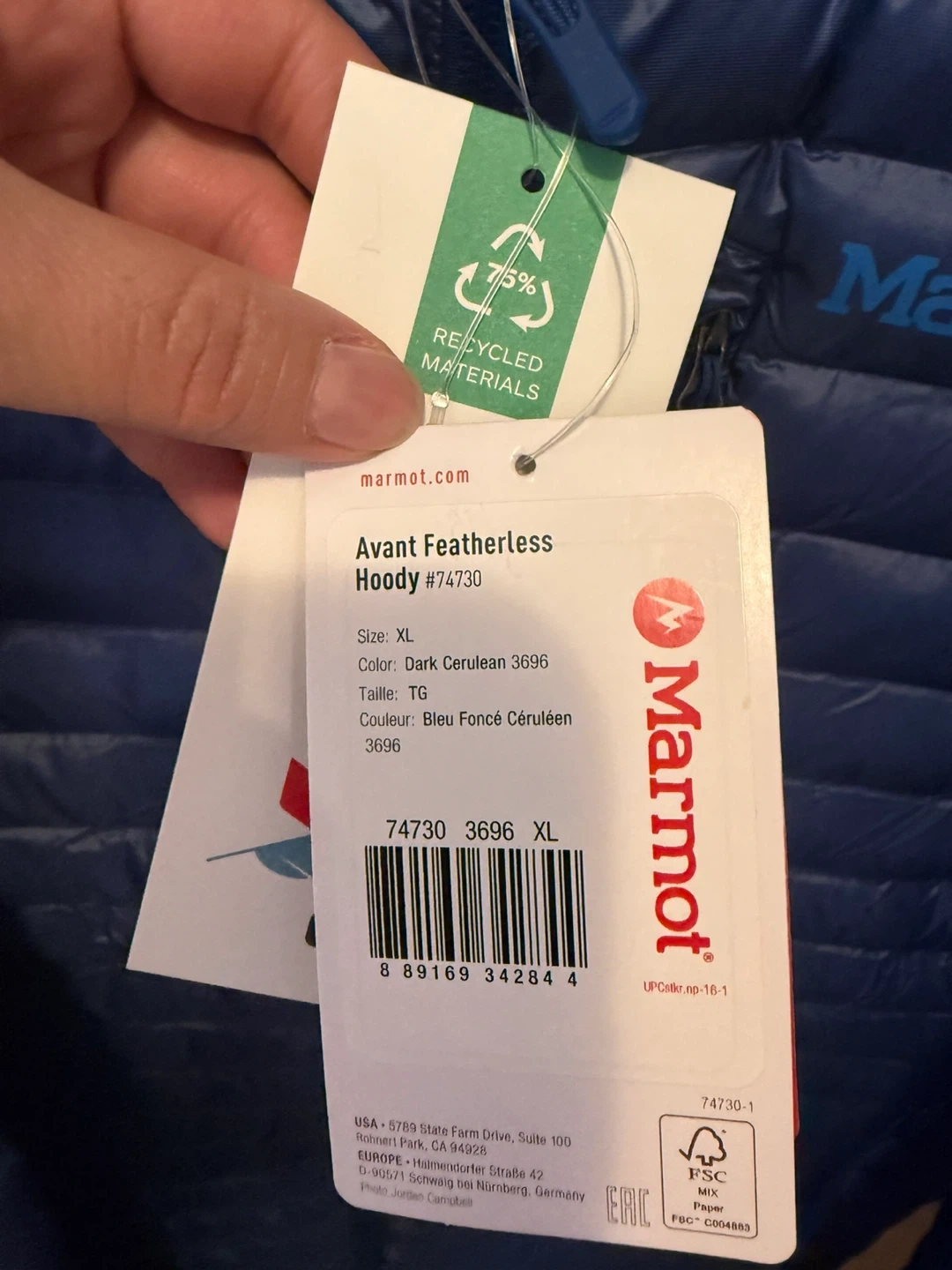 10Selling a Marmot Avant Featherless Hoody in size XL. The colour is Dark Cerulean. It's made with 75% recycled materials. Perfect for staying warm on chilly days!