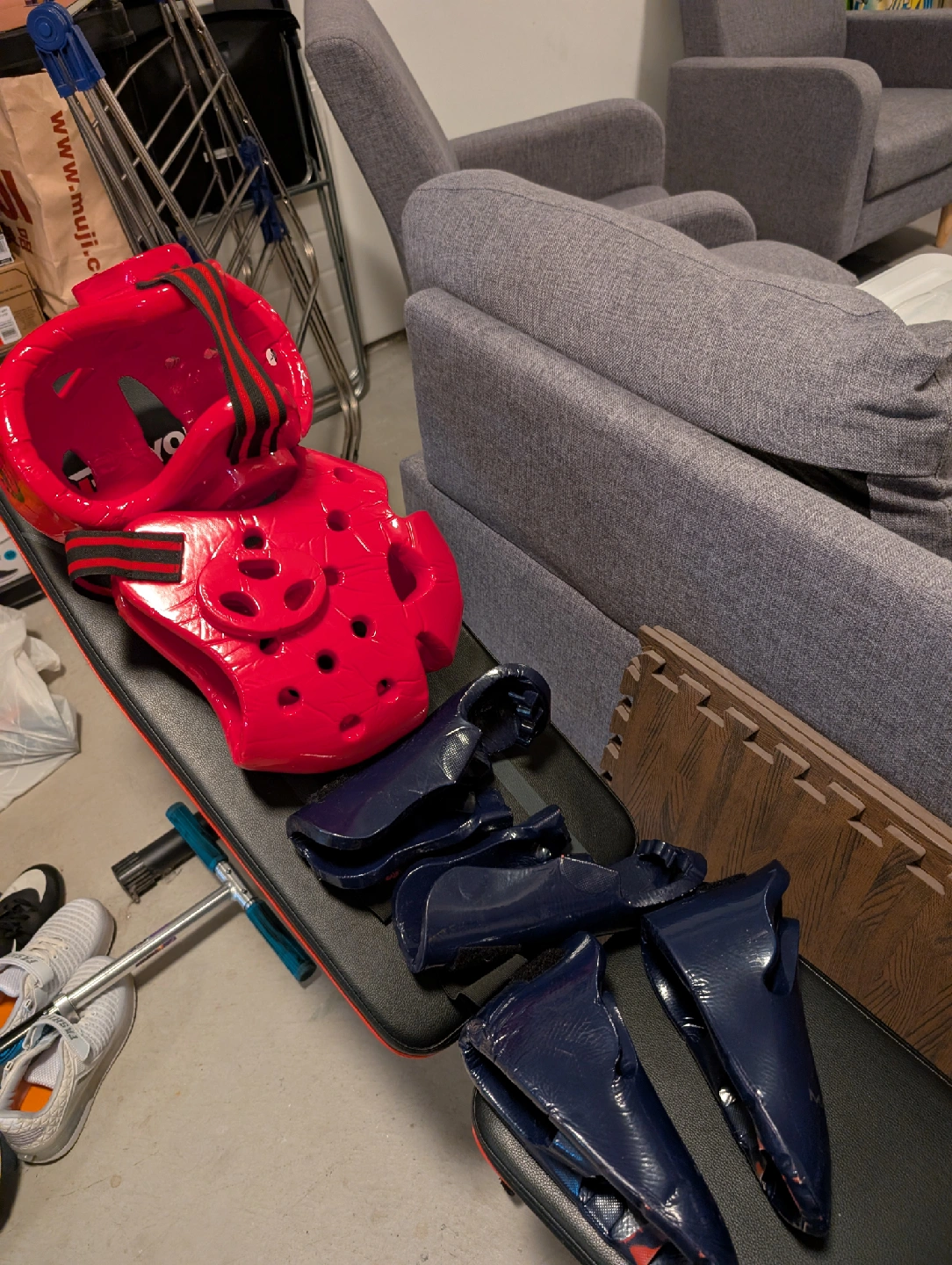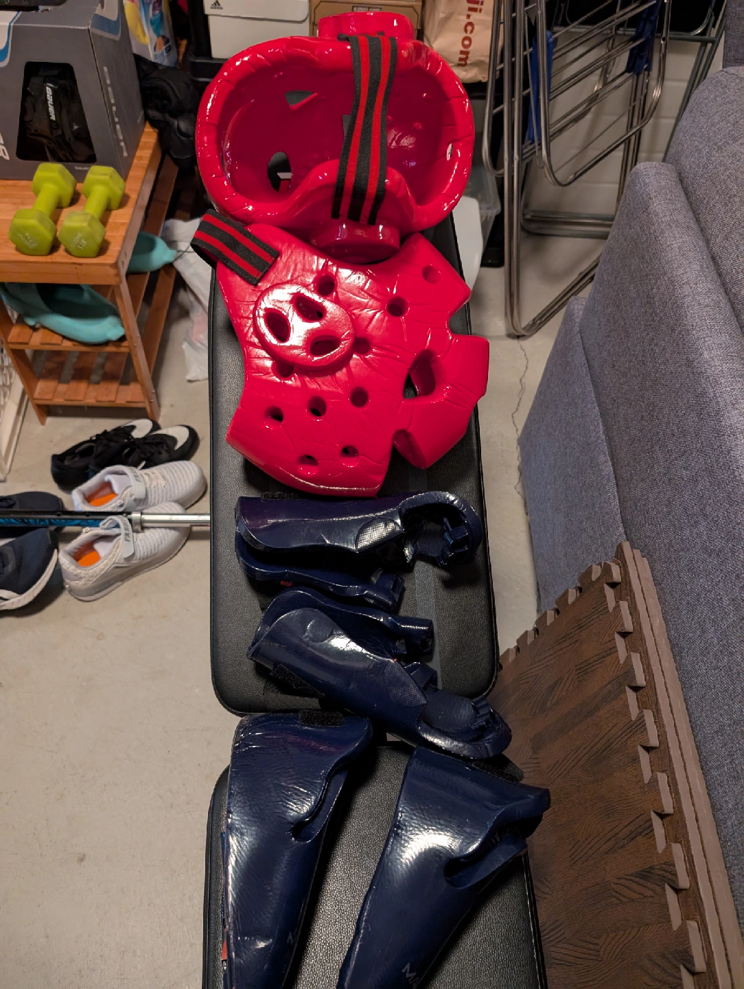 Selling a martial arts sparring gear set. Includes a red head guard and blue shin guards. Great for anyone getting into martial arts or needing a new set of gear