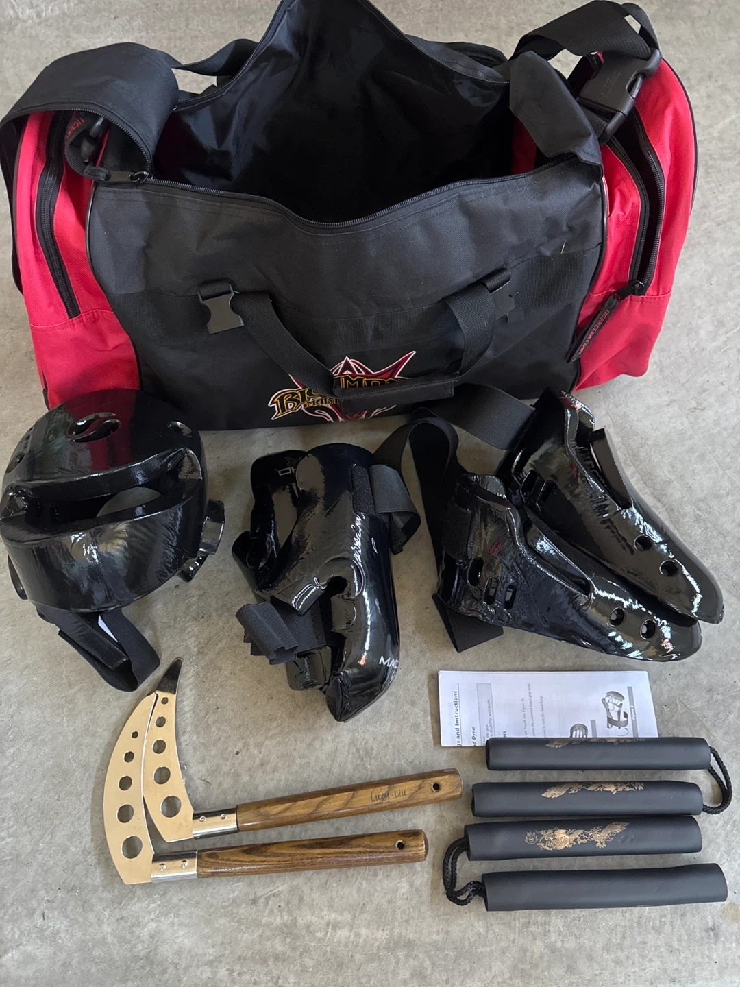 Selling a complete set of martial arts sparring gear, including a head guard, hand protectors, foot protectors, wooden training tools, and a carrying bag! Everything you need to practice safely and effectively