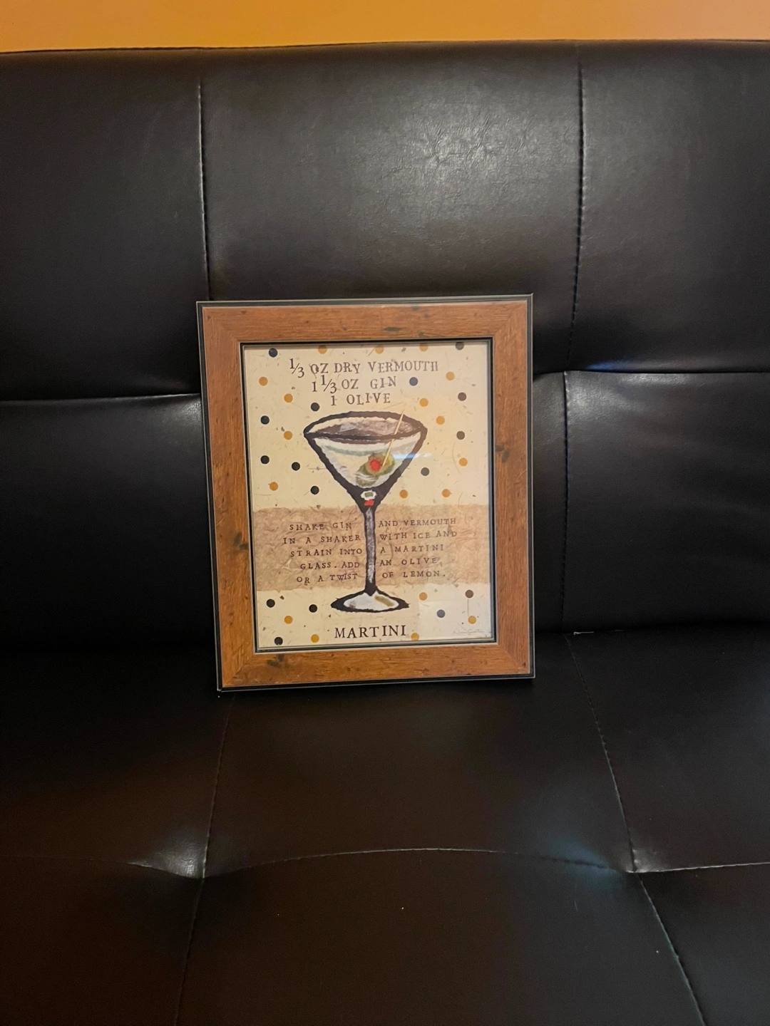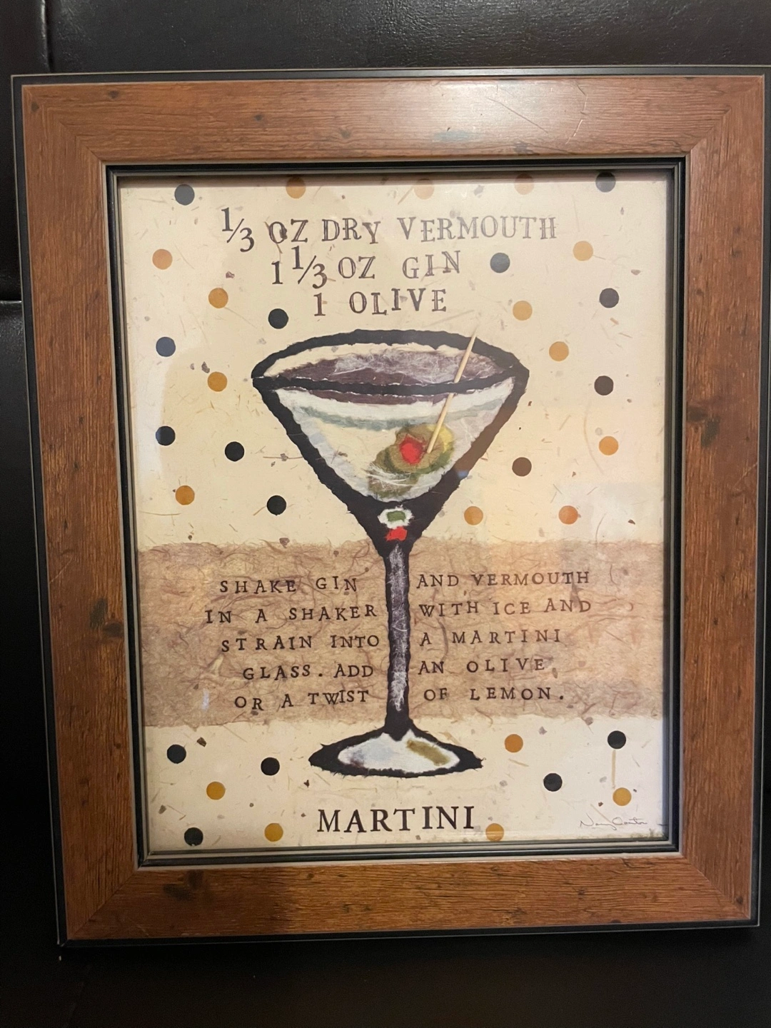 10Cute framed art print featuring a martini recipe! It adds a fun touch to any room or a bar area. The frame is a nice wood tone and the print itself is in great condition