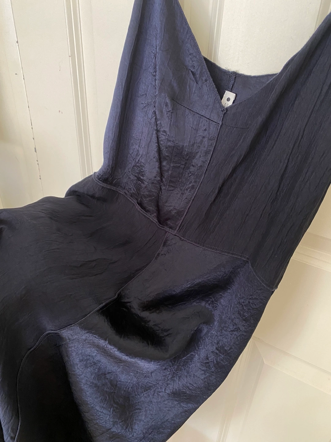 A navy blue slip dress with adjustable spaghetti straps. It features a V-neckline and a midi length. The fabric has a crinkled texture. This dress is suitable for evening wear.