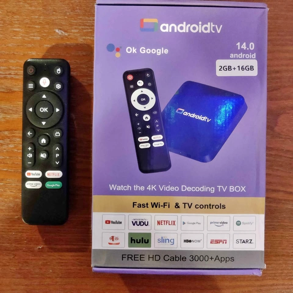 Awesome Android TV Box! runs Android 14.0. Comes with 2GB RAM and 16GB storage. Chromecast built-in so you can cast from your phone or tablet. Works with Ok Google for voice commands. Fast Wi-Fi and TV controls. Can watch YouTube, Netflix, Prime Video, Hulu, HBO Now, ESPN, Spotify, and more. Super easy to get all your favorite shows and movies.