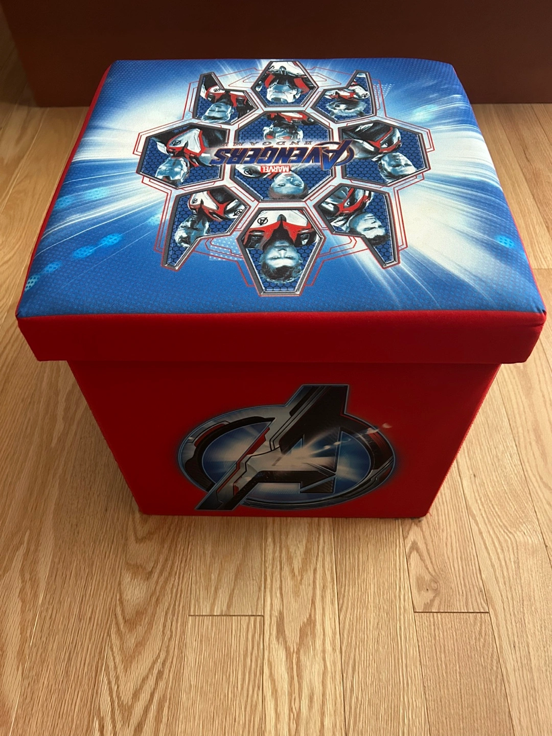 10Avengers fans, this storage ottoman is perfect for keeping toys, books, or blankets organized! It features a vibrant Avengers Endgame design and is in great condition. The ottoman has a lift-off lid for easy access to the storage space inside. It's both functional and a fun addition to any kid's room or playroom! Measures 15” (length) x 15” (width) x 15” (height). Can be folded flat when not in use.