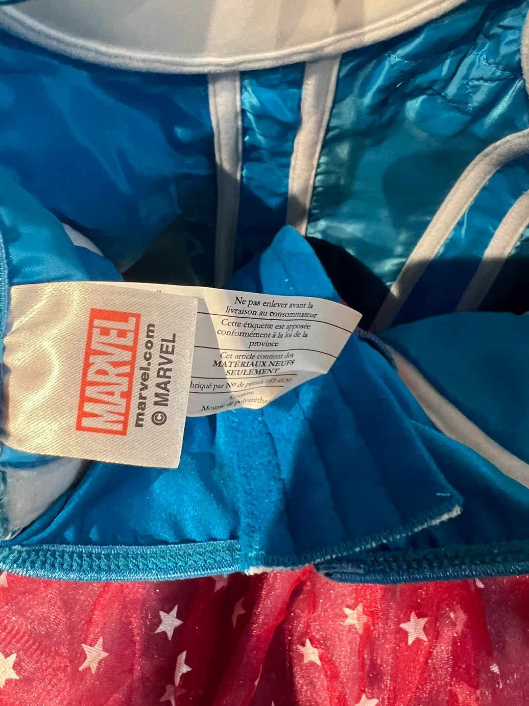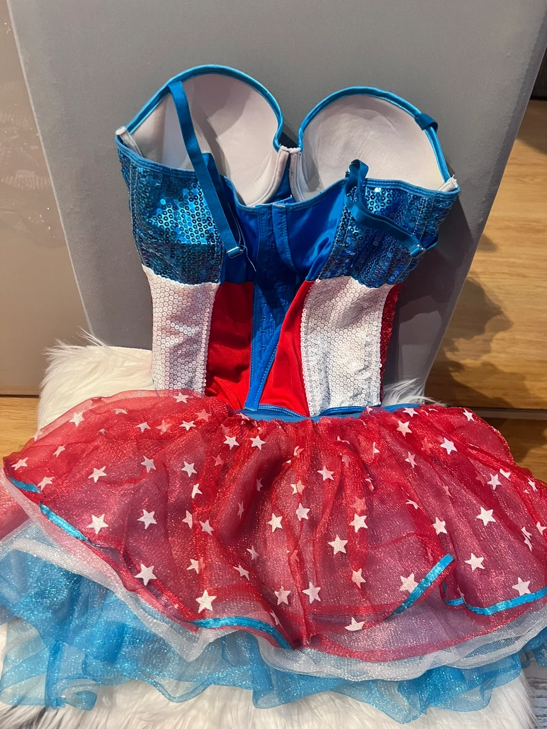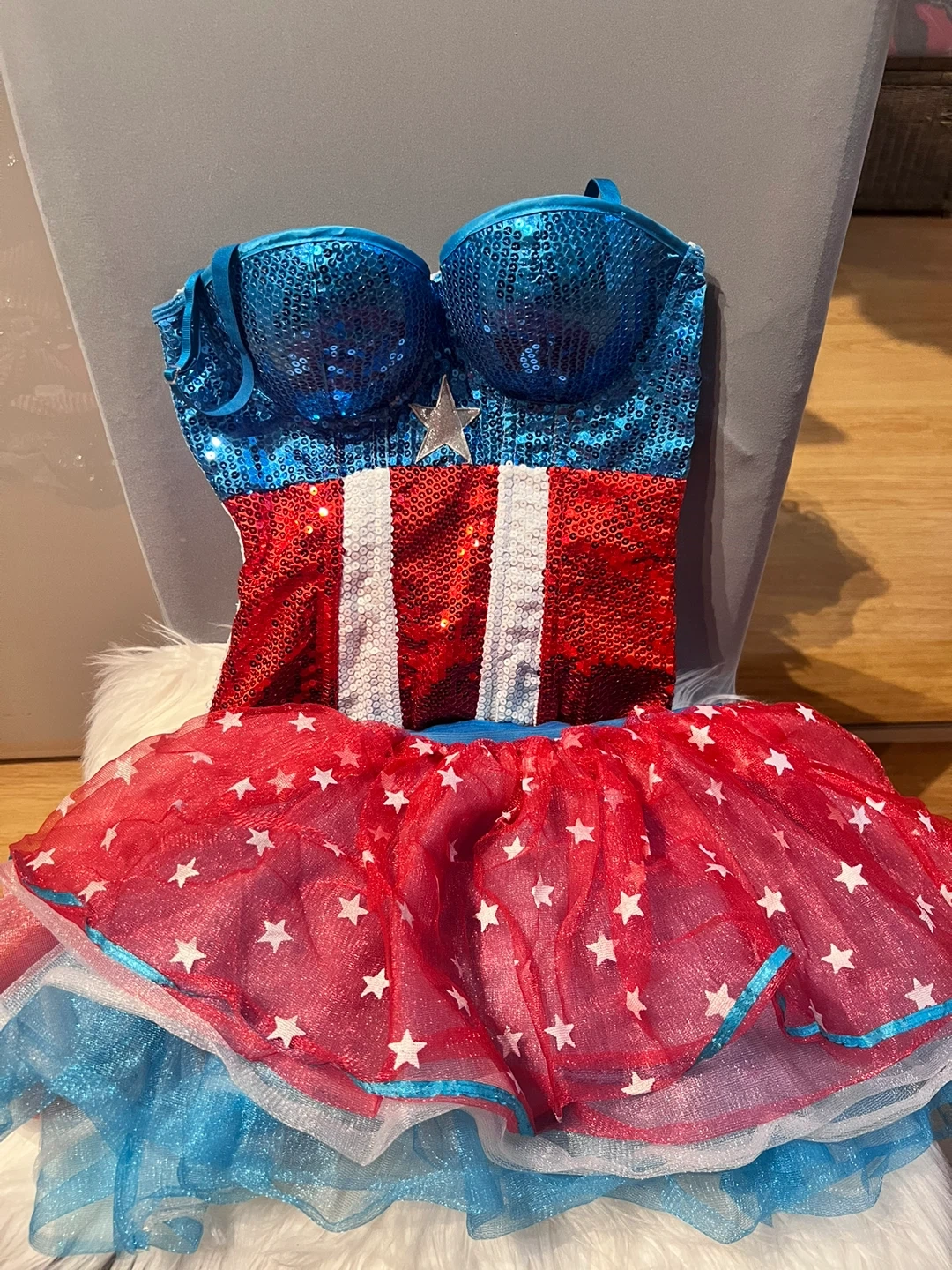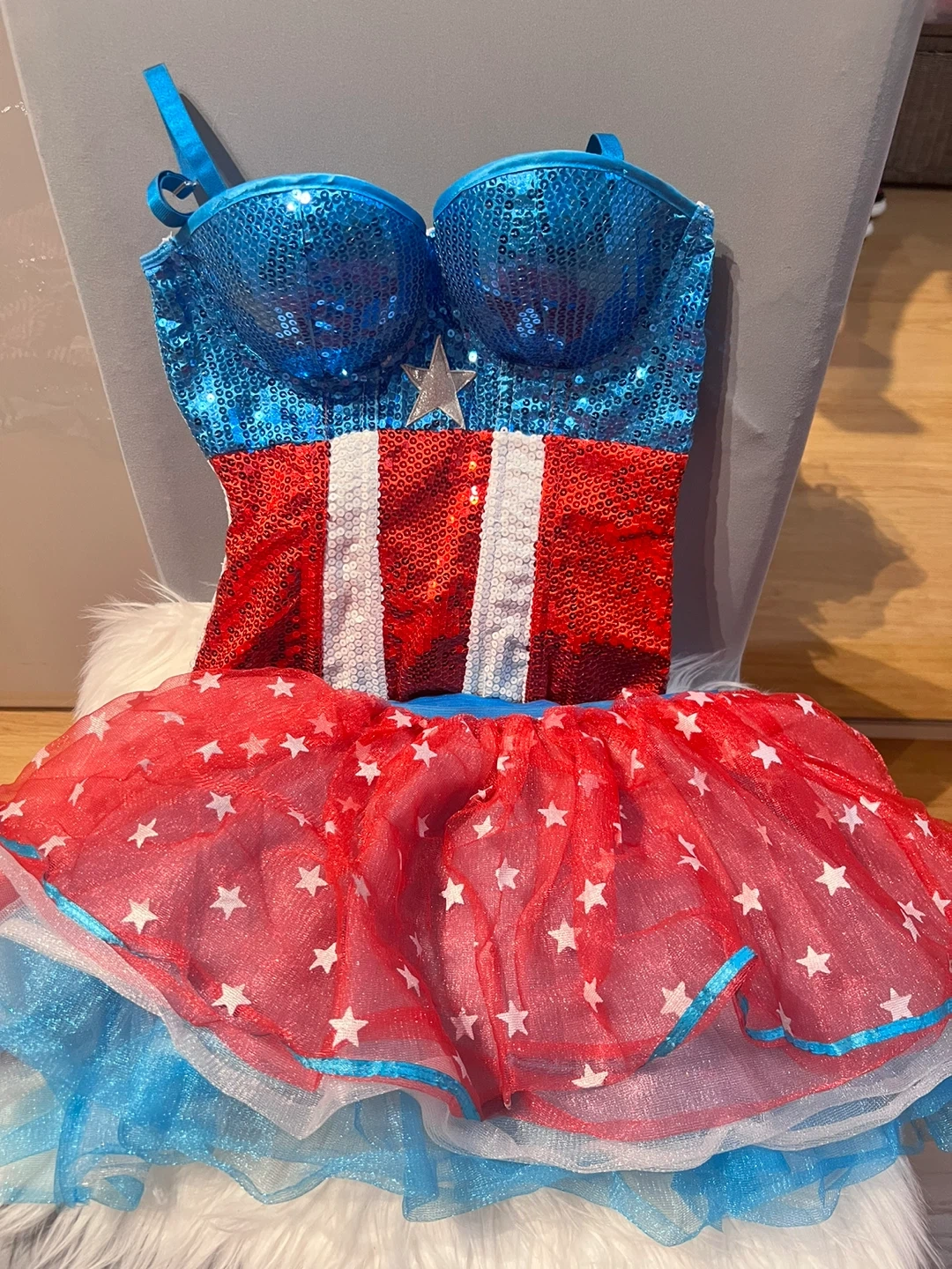 Selling Captain America corset and tutu from Marvel! It's a fun costume or dress-up outfit. Features a sequined bodice and a star-spangled skirt!