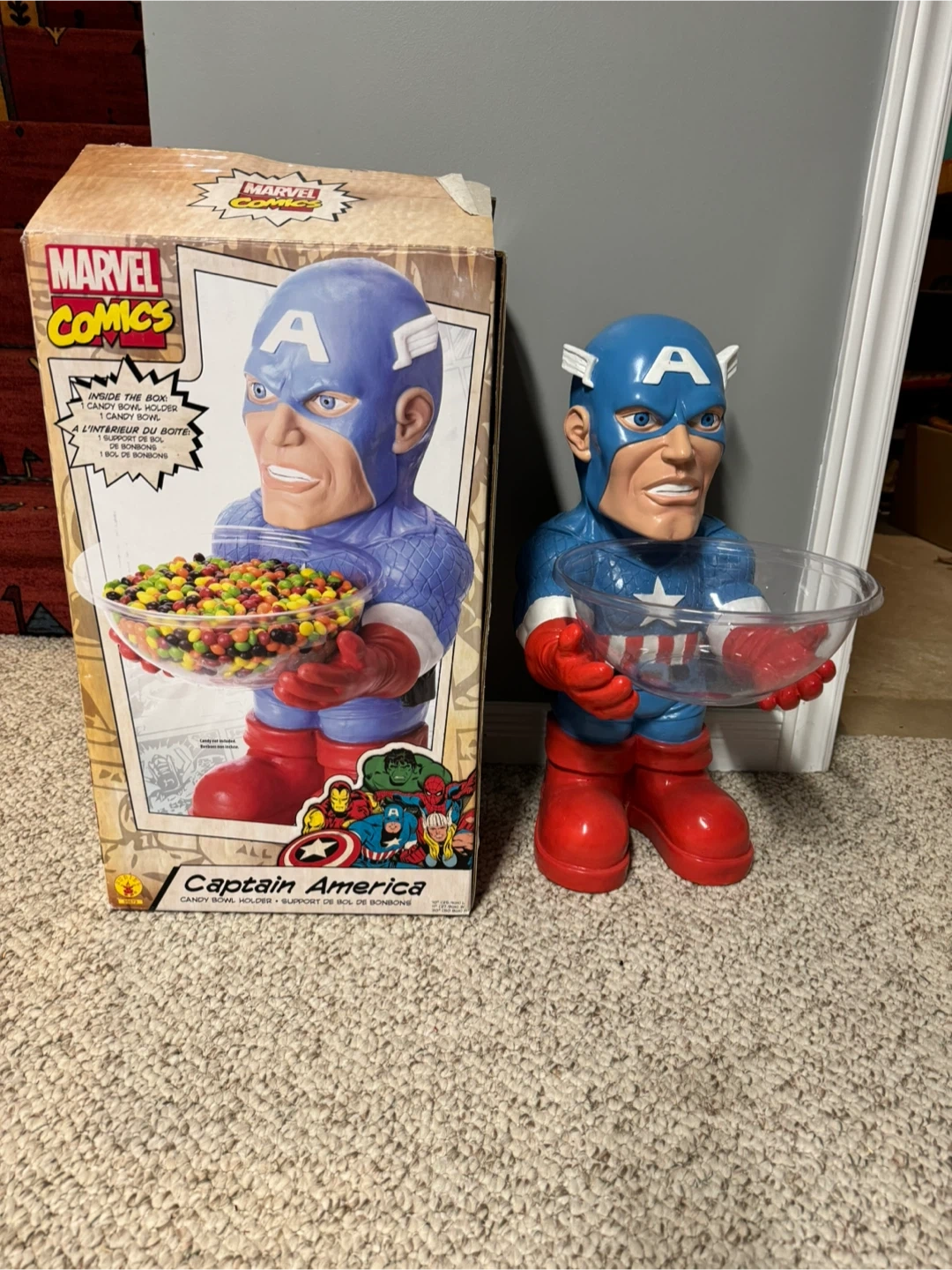 10Selling a Marvel Comics Captain America candy bowl holder! It comes with the box and the candy bowl. Perfect for any Marvel fan!
