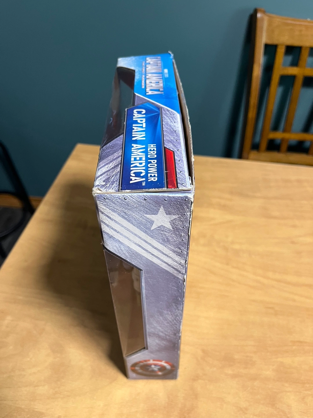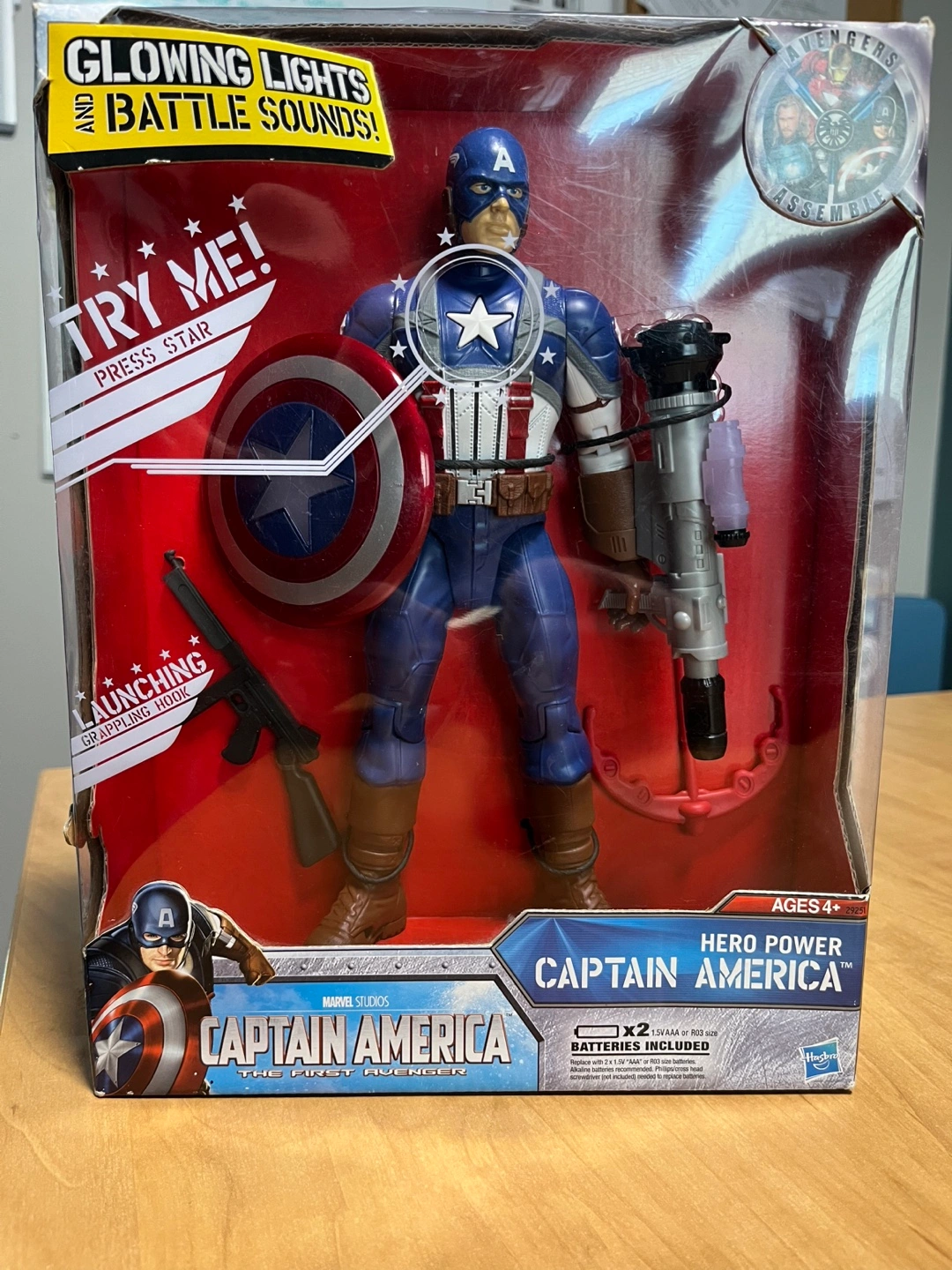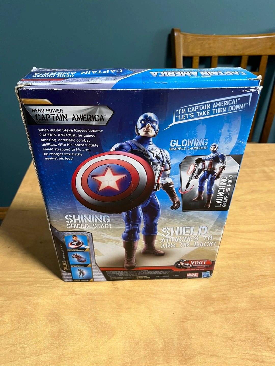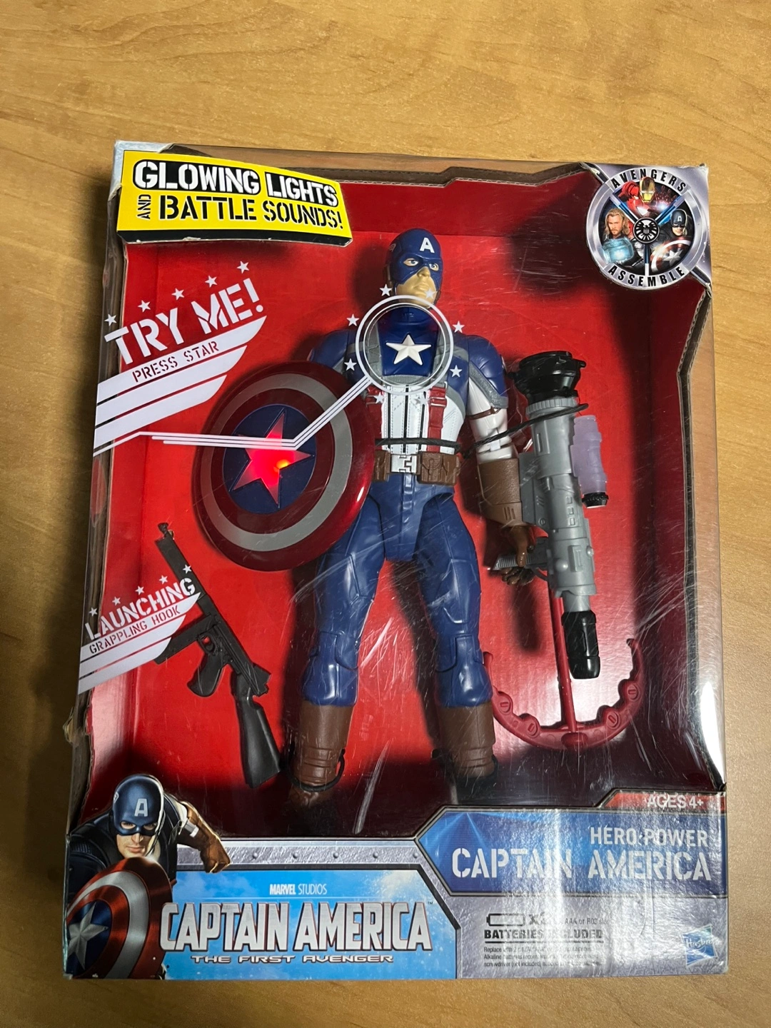 10Selling a Marvel Studios Hero Power Captain America action figure! It comes with glowing lights and battle sounds. It also includes a launching grapple hook and shield that attaches to the arm or back.