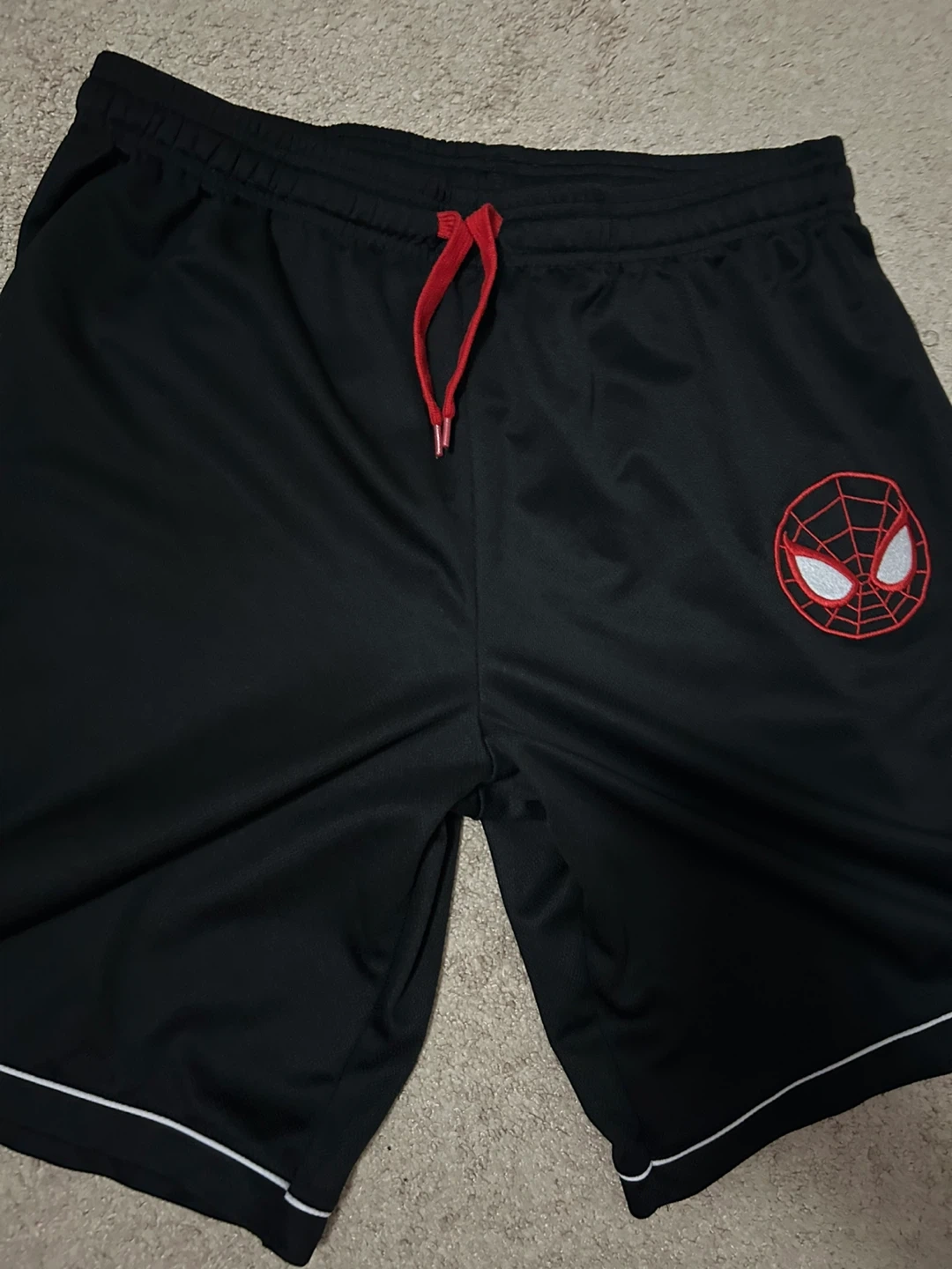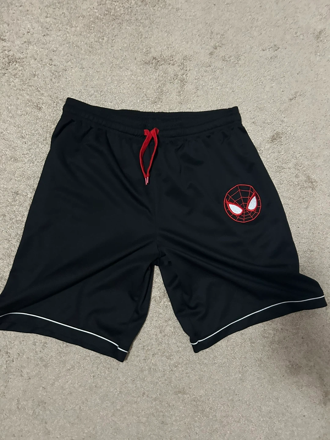 Selling a pair of Marvel Spider-Man shorts! They are black with a red Spider-Man logo on the right leg and a red drawstring. Great for lounging or hitting the gym!