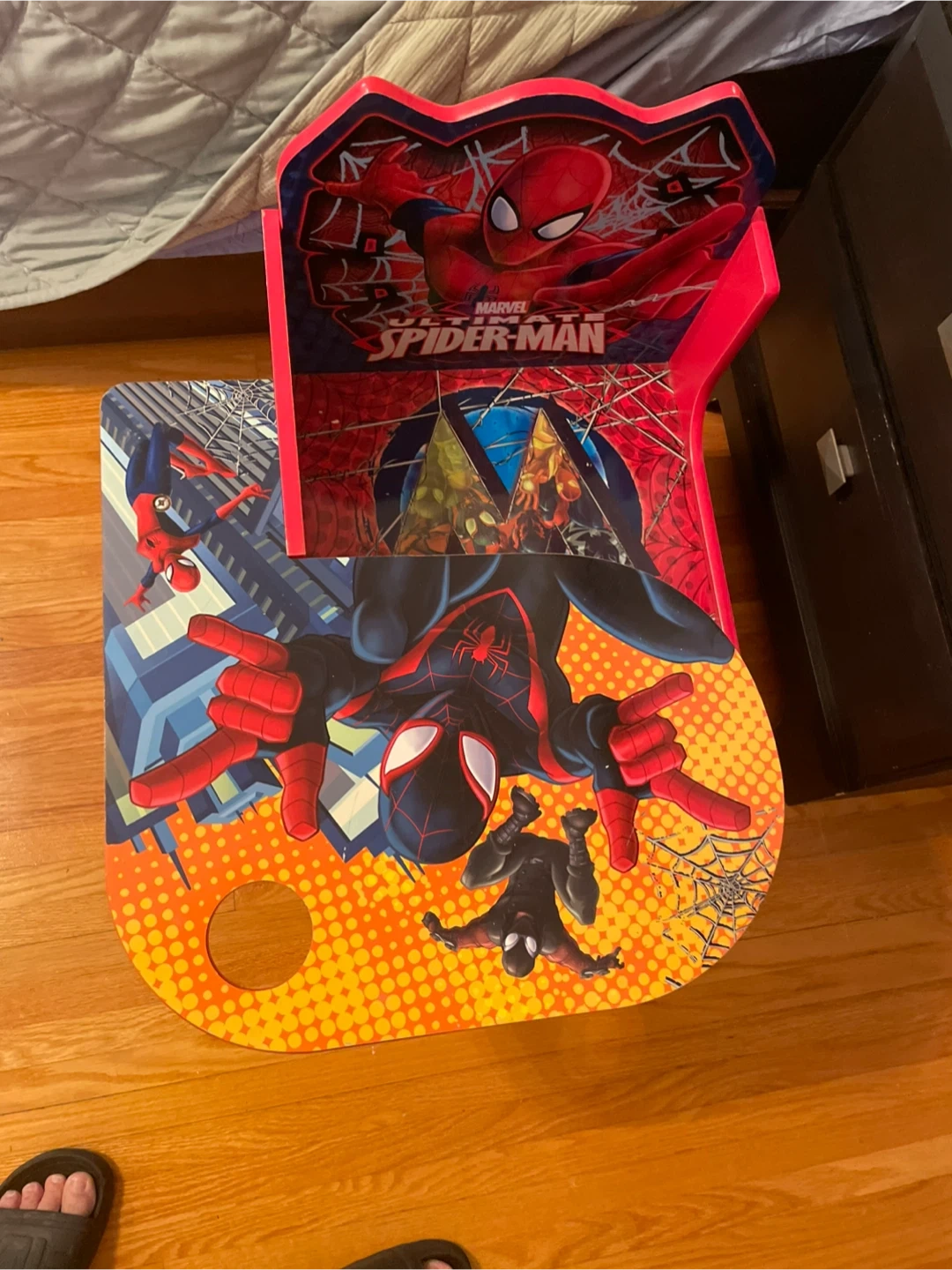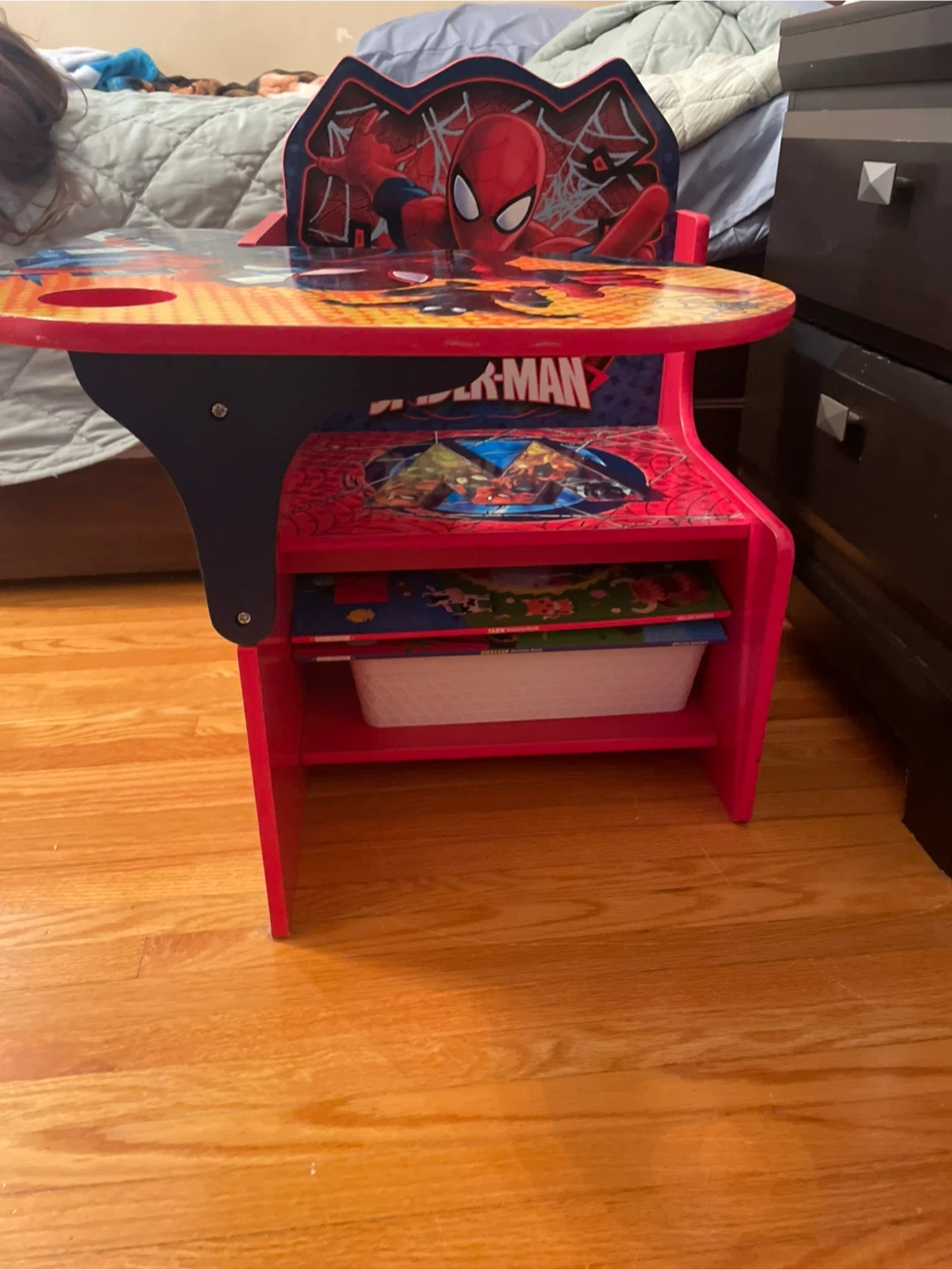 120Selling a Marvel Spider-Man desk and chair set for kids! It's in great shape and perfect for a little superhero's workspace. The set features vibrant Spider-Man graphics and a sturdy design. It also includes a storage shelf underneath the seat for books and supplies