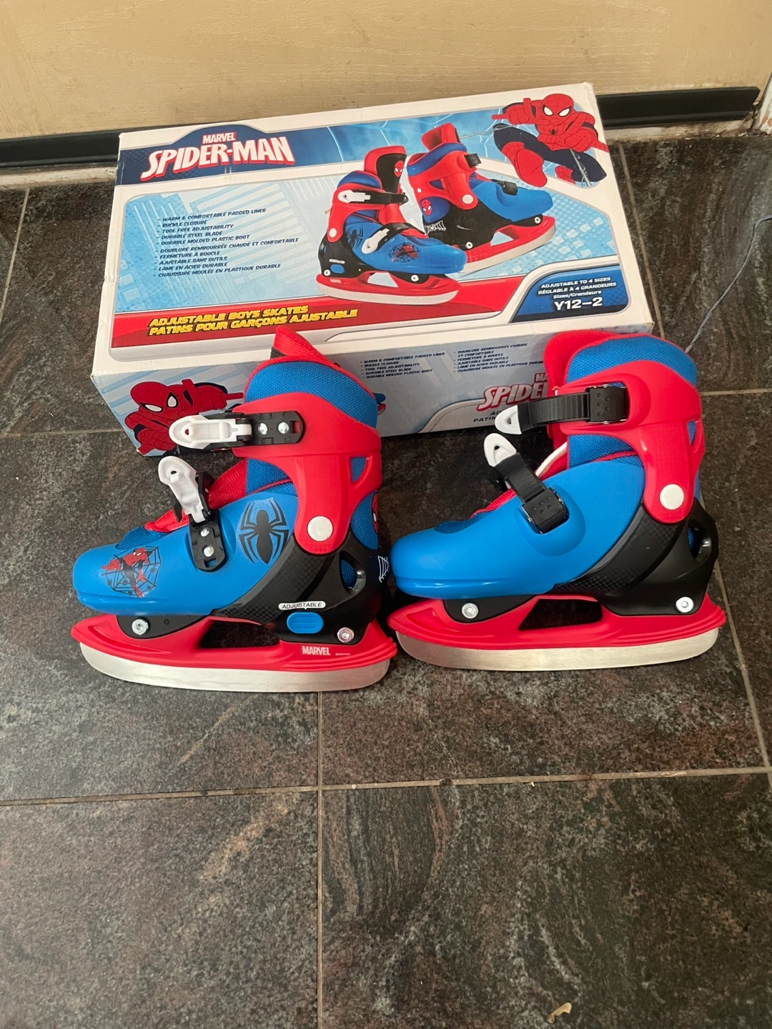 Adjustable boys' ice skates. Spiderman design. Blue and red. Size Y12-2. Features include a warm and comfortable padded liner, buckle closure, tool-free adjustability, durable steel blade, and durable molded plastic boot.