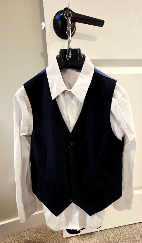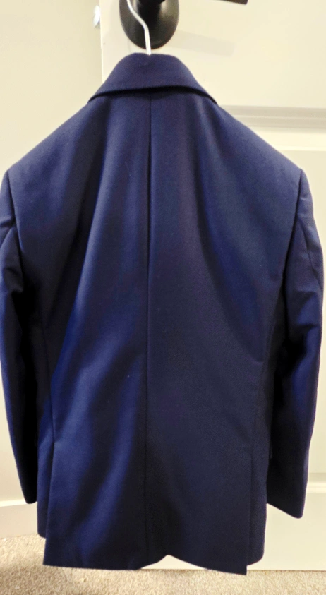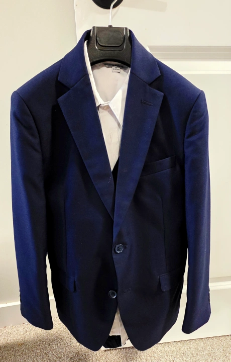 60Selling a boy's three-piece suit from Marvellous World in navy blue. It includes the jacket, vest, bonus shirt, and pants. Comes with a garment bag for storage. Ideal for all occasions including first Holy Communion. Suitable for ages 8-12 years.