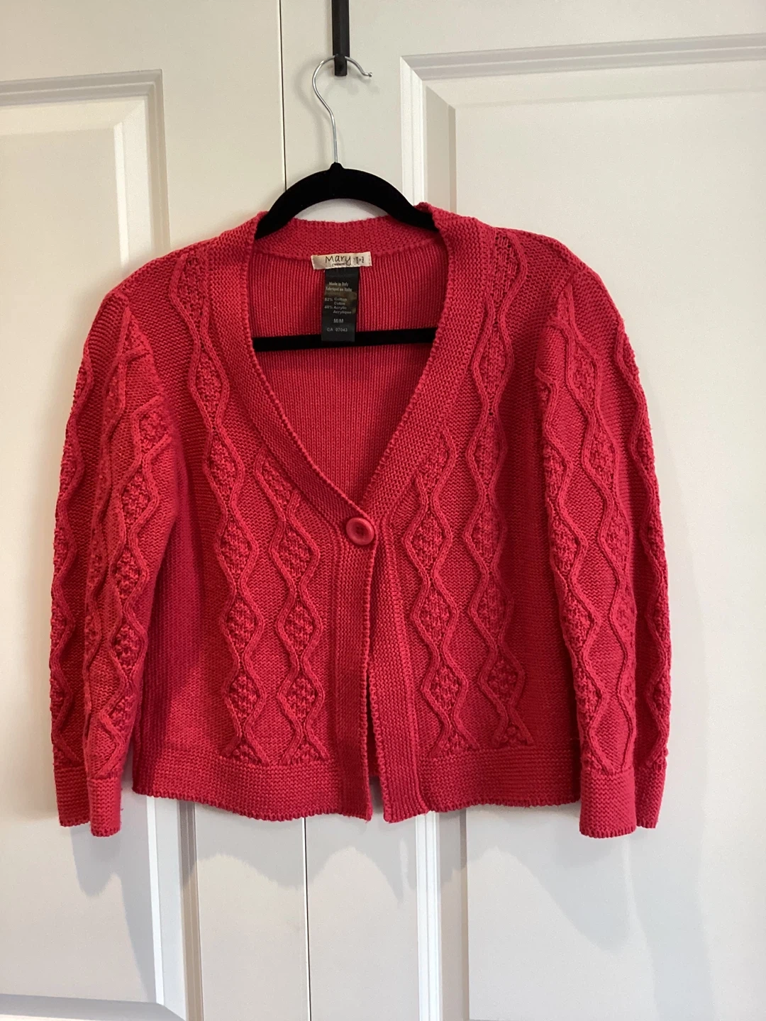 207Mary by Firenze Pink Cardigan, made in Italy, 52 percent Cotton 48 percent Acrylic, size Medium, minor signs of wear, $12 or best offer. Chest 35” Centre back length 19 3/4”