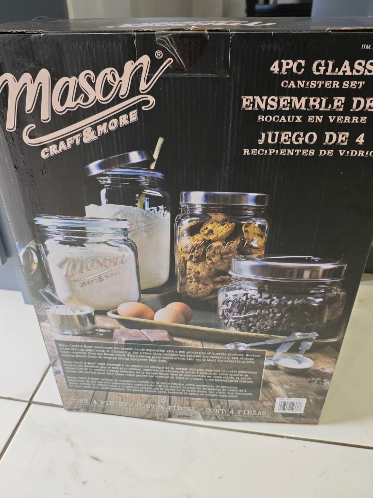 Selling a Mason Craft & More 4-piece glass canister set! This set is perfect for storing, organizing, or displaying your goods. The durable products and vintage construction make it ideal for everything from keeping grains fresh to keeping sewing equipment organized. Comes in its original box