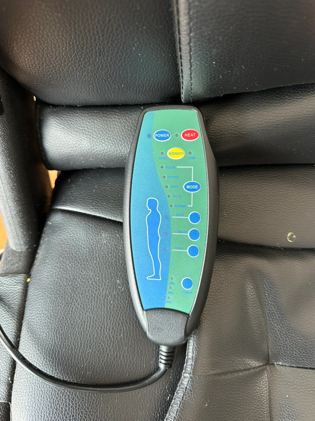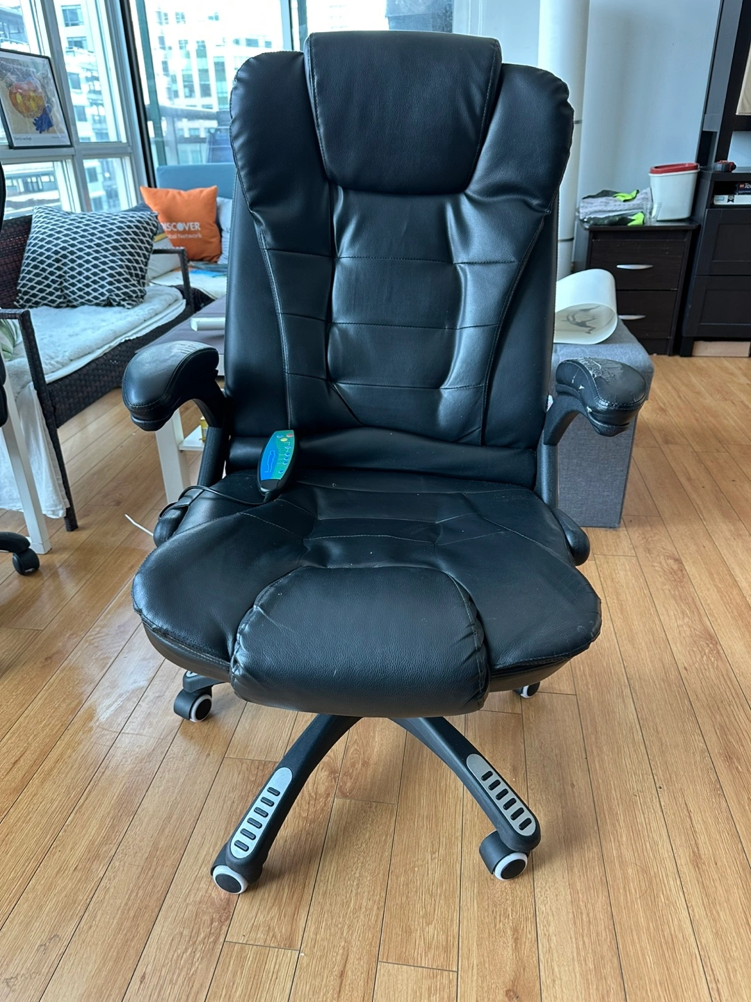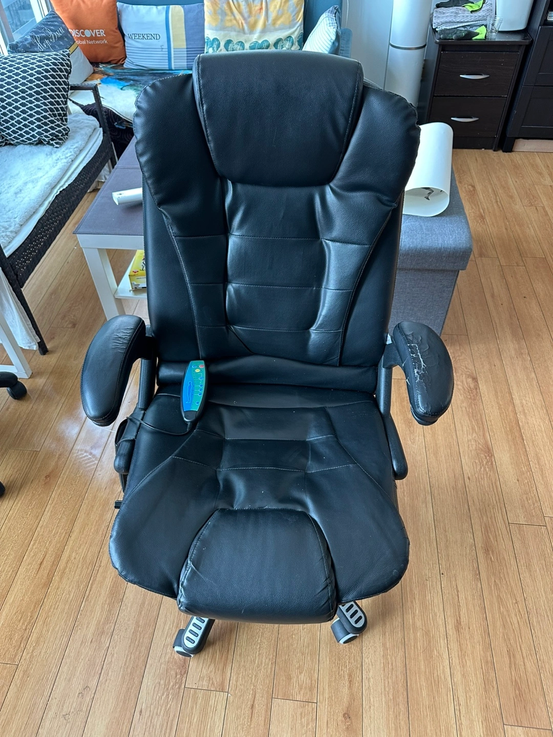 Black leather massage chair. Features include heat and multiple massage modes. Includes remote control. Some wear and tear visible on armrests. Excellent for home office or relaxation.