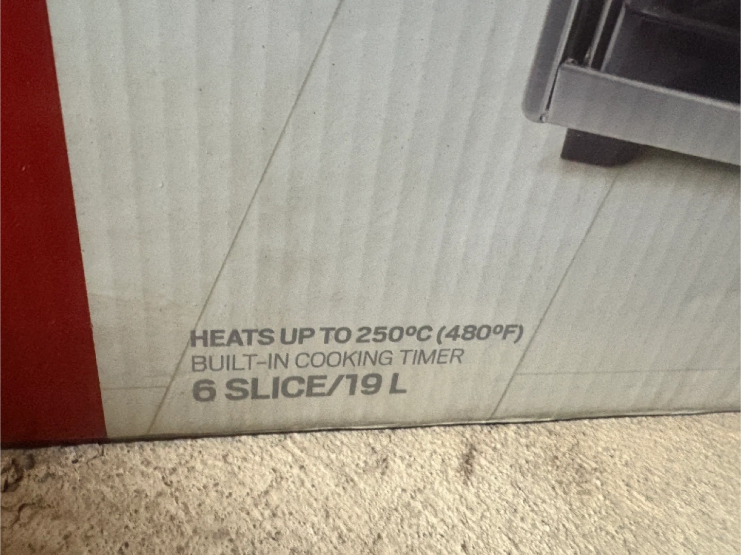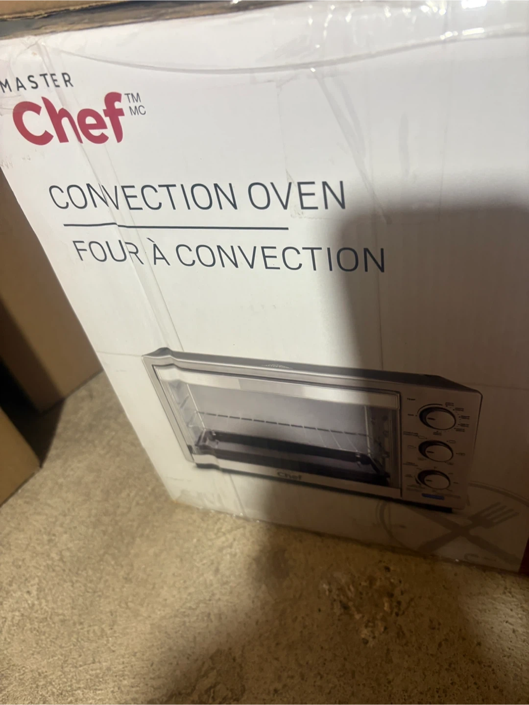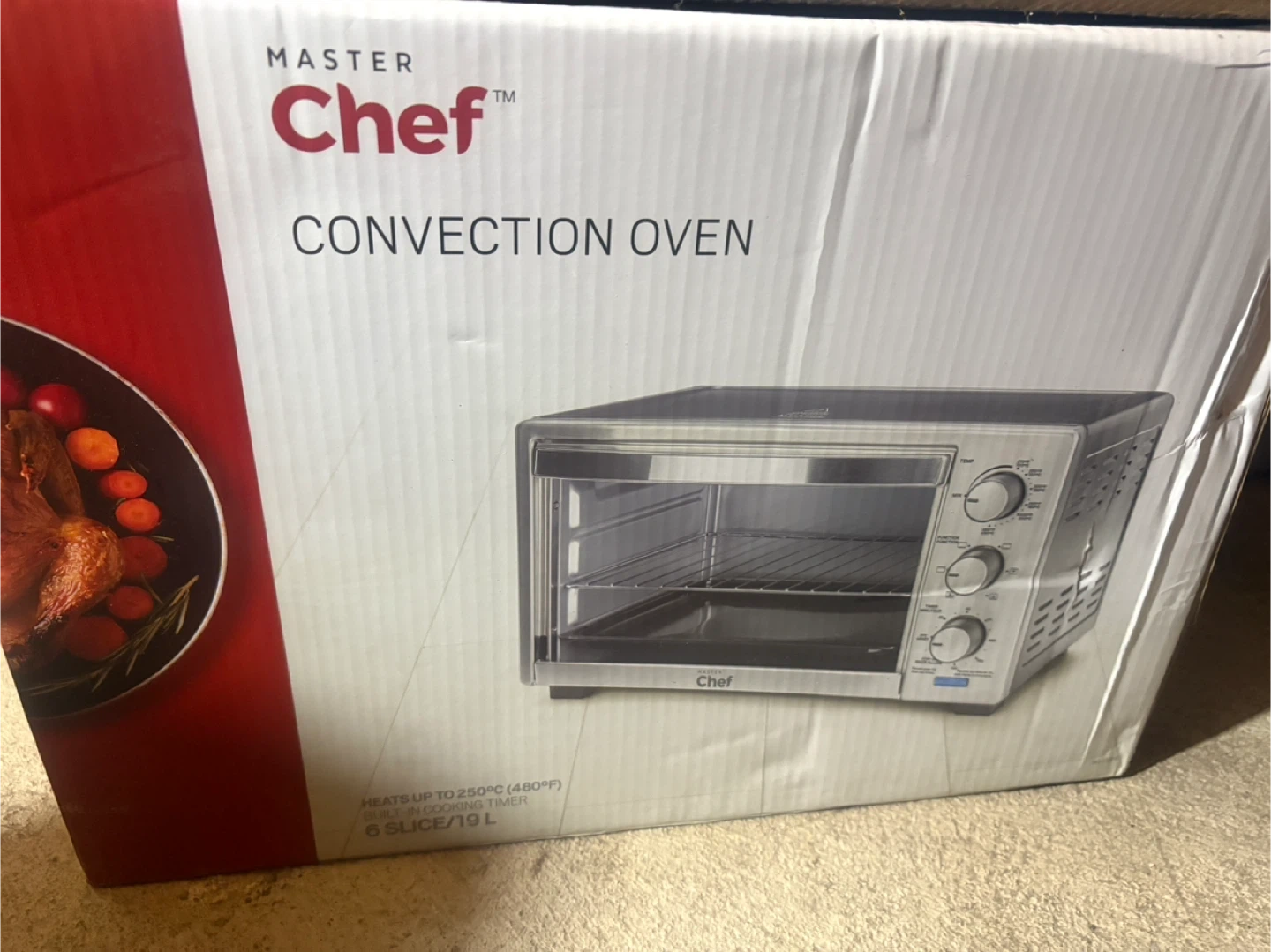 Selling a Master Chef Convection Oven that's in excellent condition, practically new! It heats up to 250°C (480°F) and has a built-in cooking timer. It's a 6 slice/19 L capacity oven. Comes with the original box