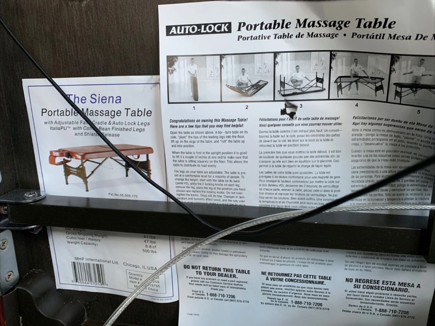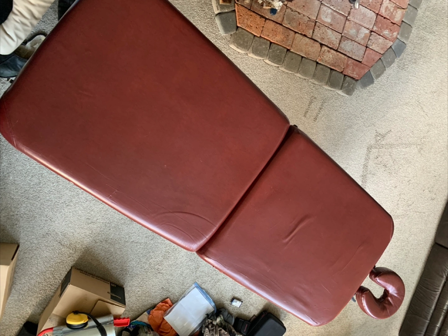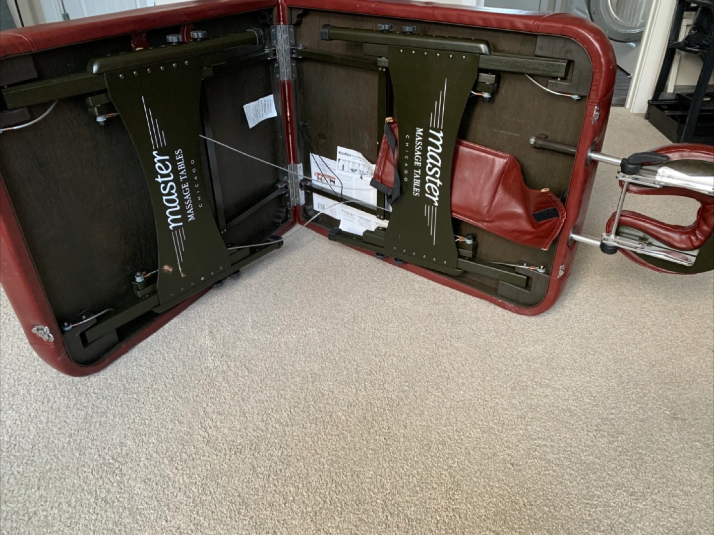 83Portable massage table. Features auto-lock legs and adjustable face cradle. Brown vinyl upholstery. Good used condition.