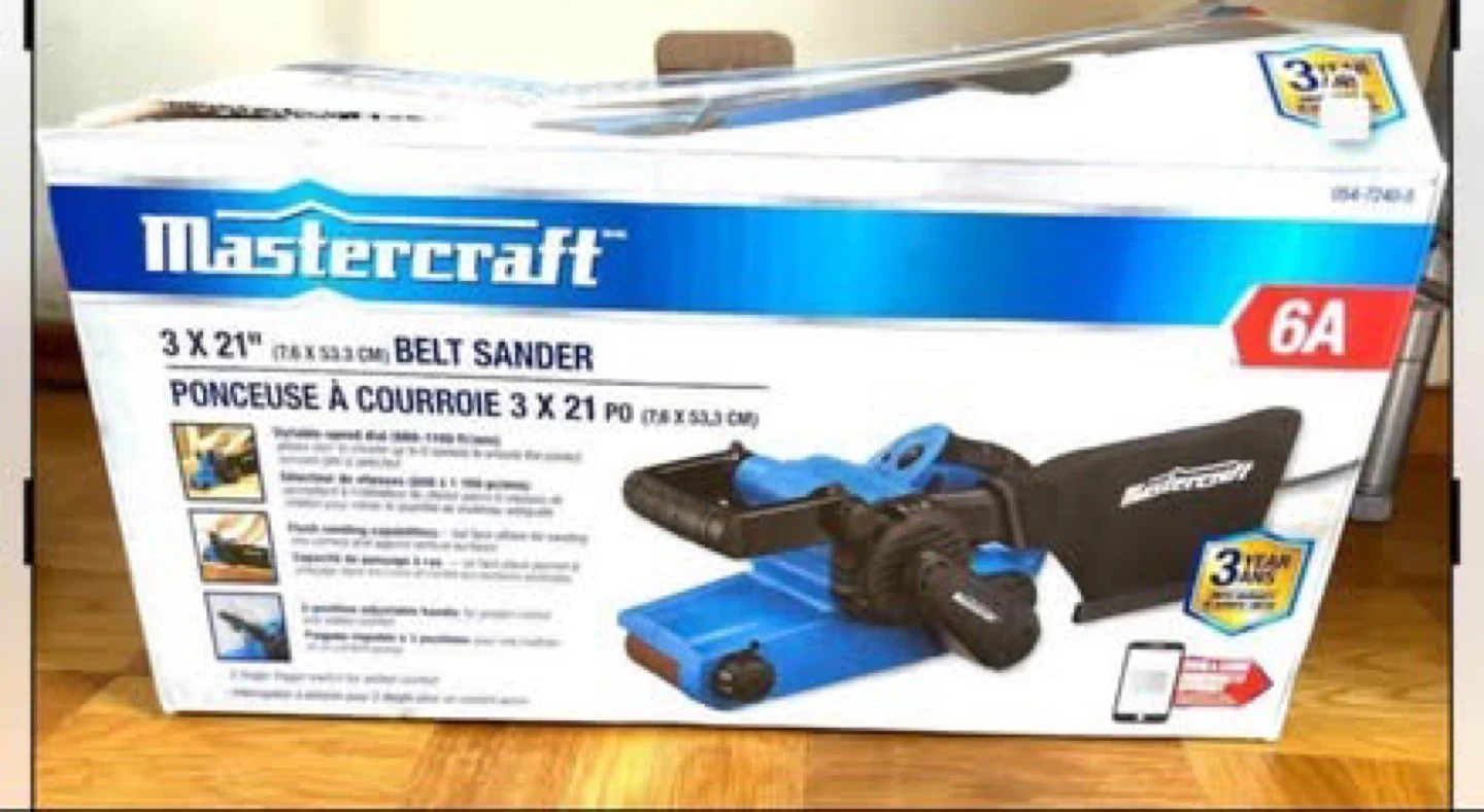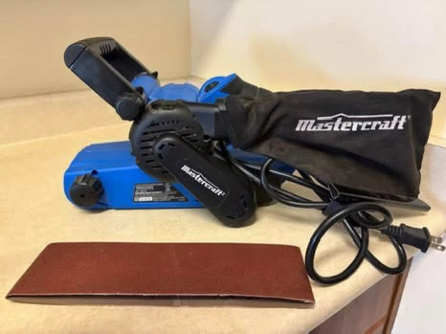 218Mastercraft 6A Corded 5-Speed Belt Sander is versatile built to handle any sanding project, from smoothing rough wood to distressing furniture. The dust bag with zipper helps maintain a clean workspace by capturing debris while the lock-on trigger switch makes long sanding sessions more comfortable. The sander also comes with an 80-grit sanding belt, and orig. box. Cash only price firm.
