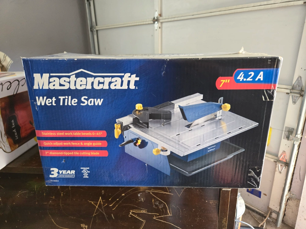 Selling a brand new Mastercraft 7" Wet Tile Saw, still in its original box! This saw features: - Stainless steel work table that bevels 0-45° - Quick-adjust work fence and angle guide - 7" diamond-tipped tile cutting blade Perfect for your next tiling project!