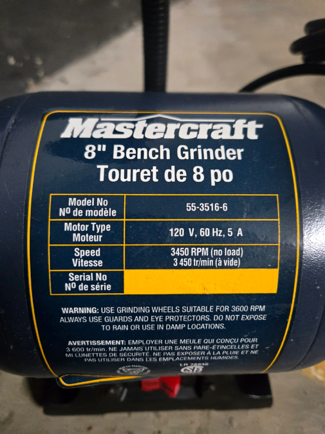 HomeBuy and sellMastercraft 8" Bench GrindergabrielDownsview100 reviewsMastercraft 8" Bench GrinderWanted · $90Selling a Mastercraft 8" Bench Grinder. It has a motor type of 120 V, 60 Hz, 5 A and a speed of 3450 RPM (no load). Model No is 55-3516-6Where to meet22 John St0 chats·0 favourites·19 viewsGet the Karrot app to chatOther listings by gabrielMastercraft 8" Bench Grinder$90Downsview