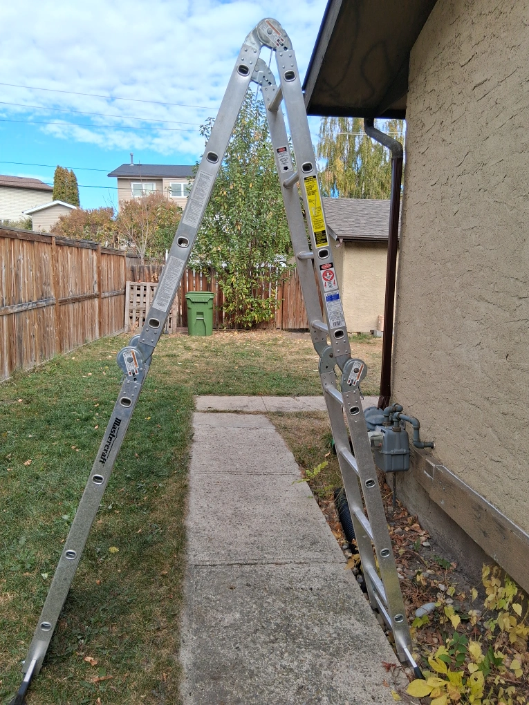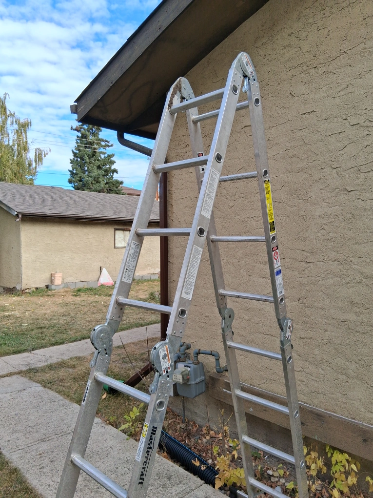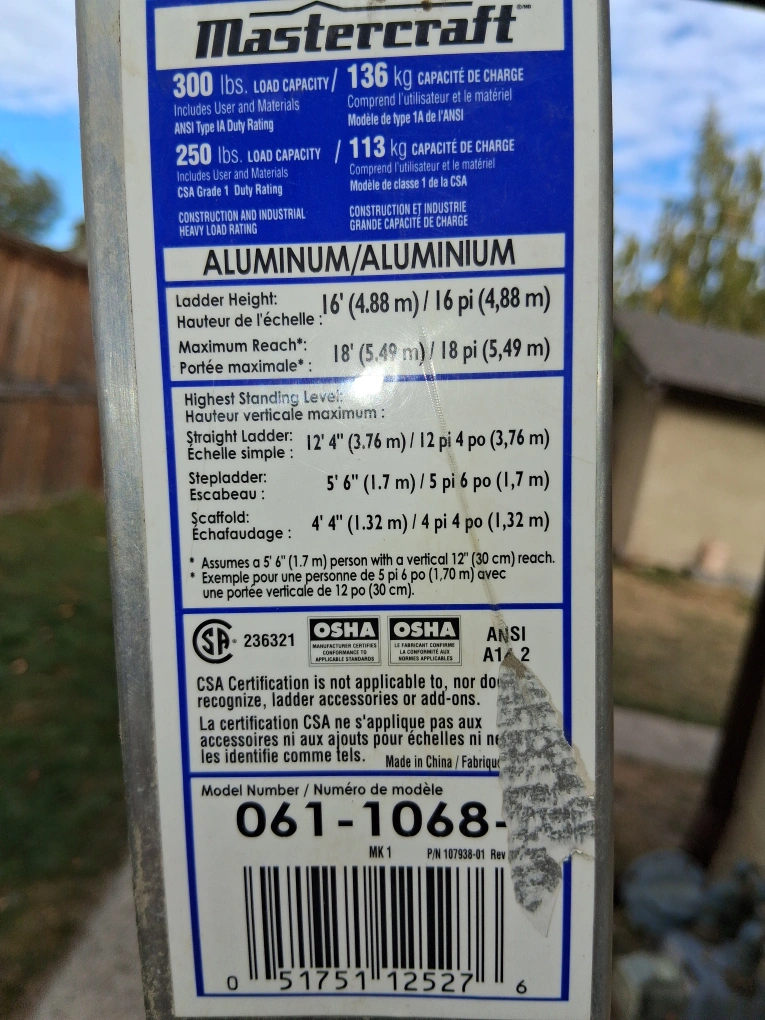 Selling a Mastercraft aluminum multi ladder. It's in good condition and ready for your next project! - Ladder Height: 16 ft (4.88 m) - Maximum Reach: 18 ft (5.49 m) - Straight Ladder: 12 ft 4 in (3.76 m) - Stepladder: 5 ft 6 in (1.7 m) - Scaffold: 4 ft 4 in (1.32 m) - Load Capacity: 300 lbs