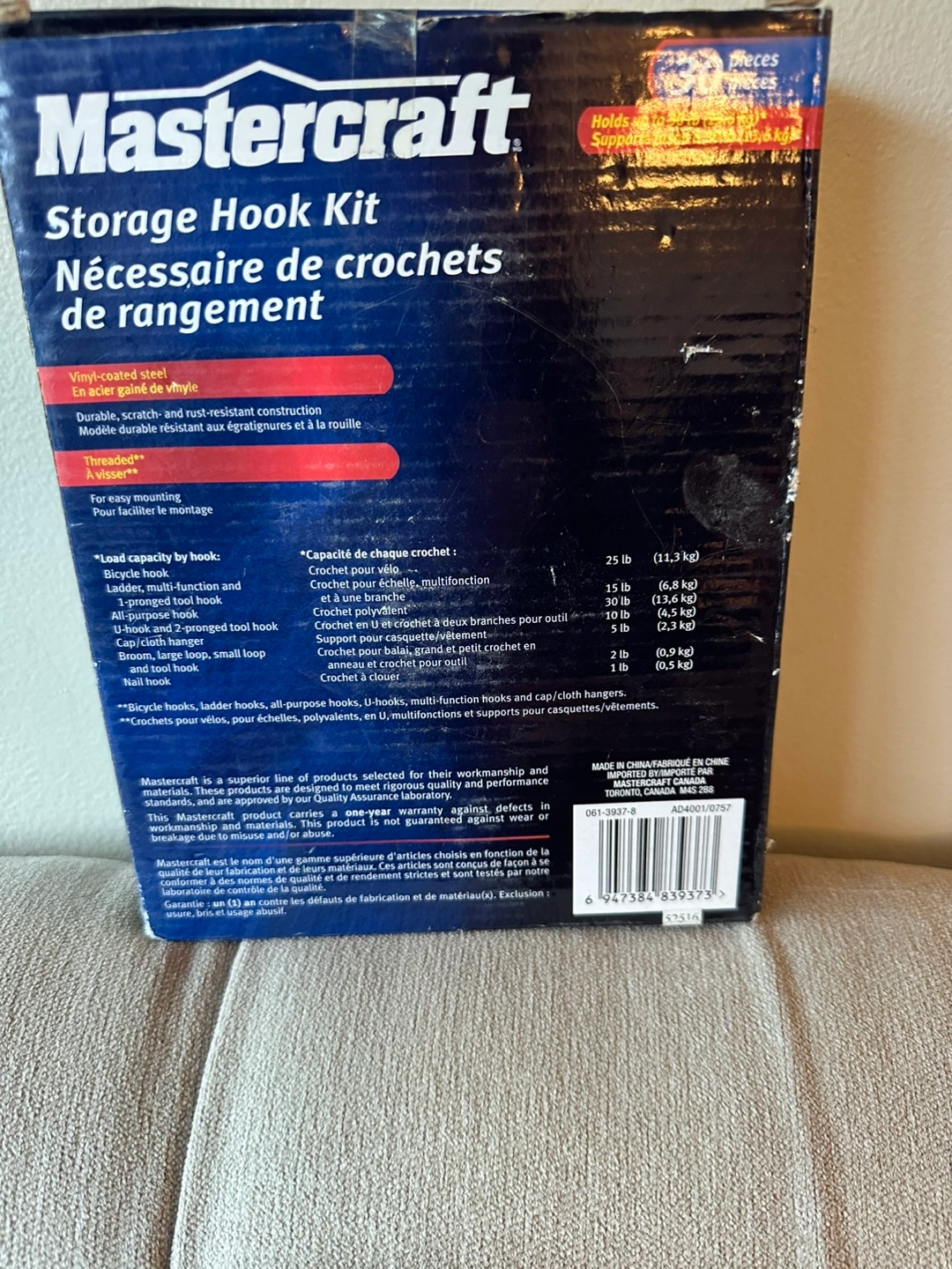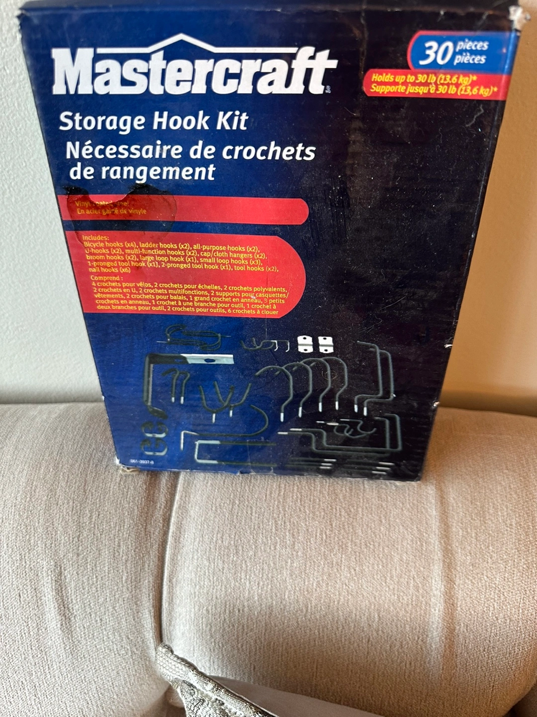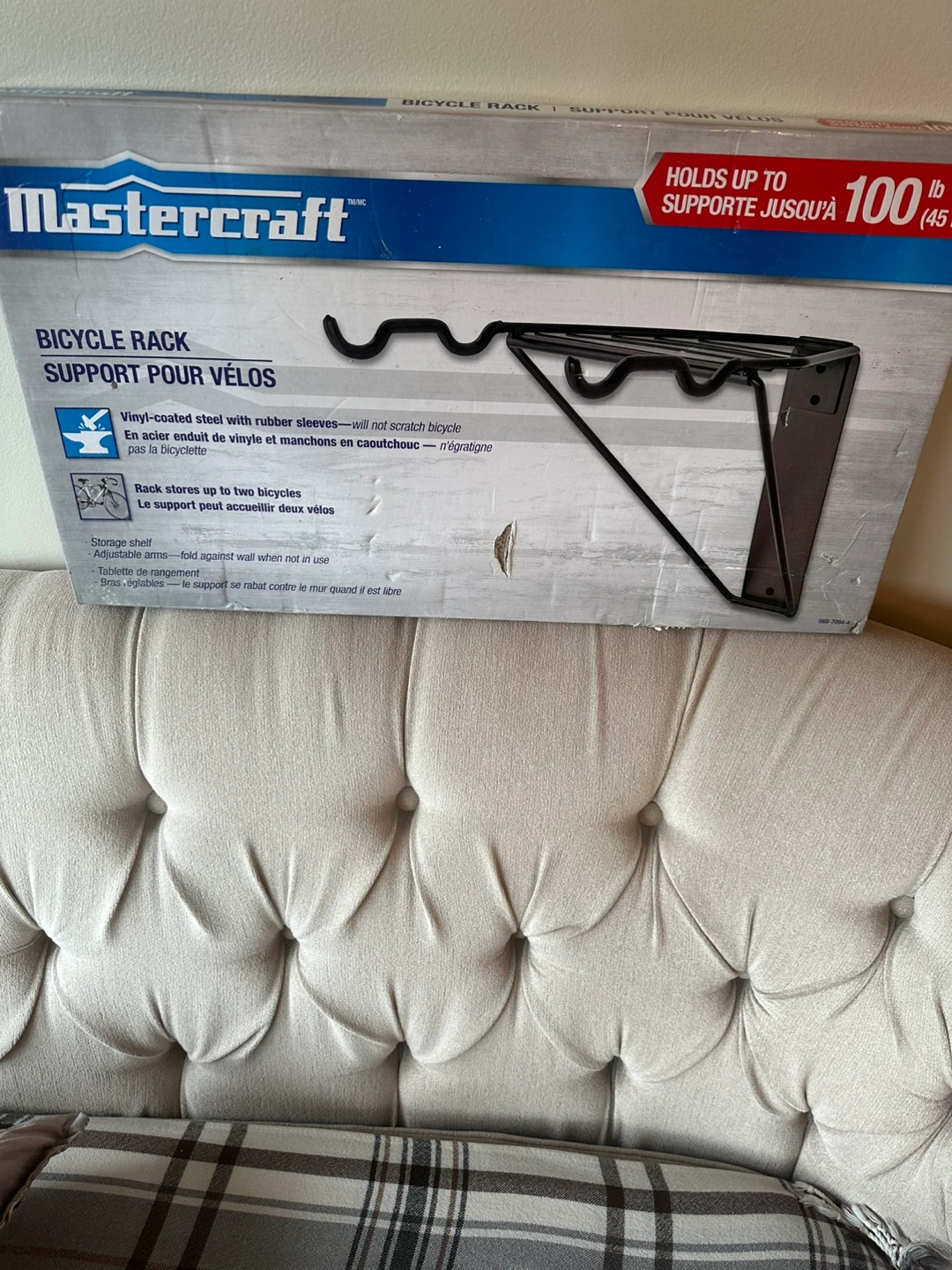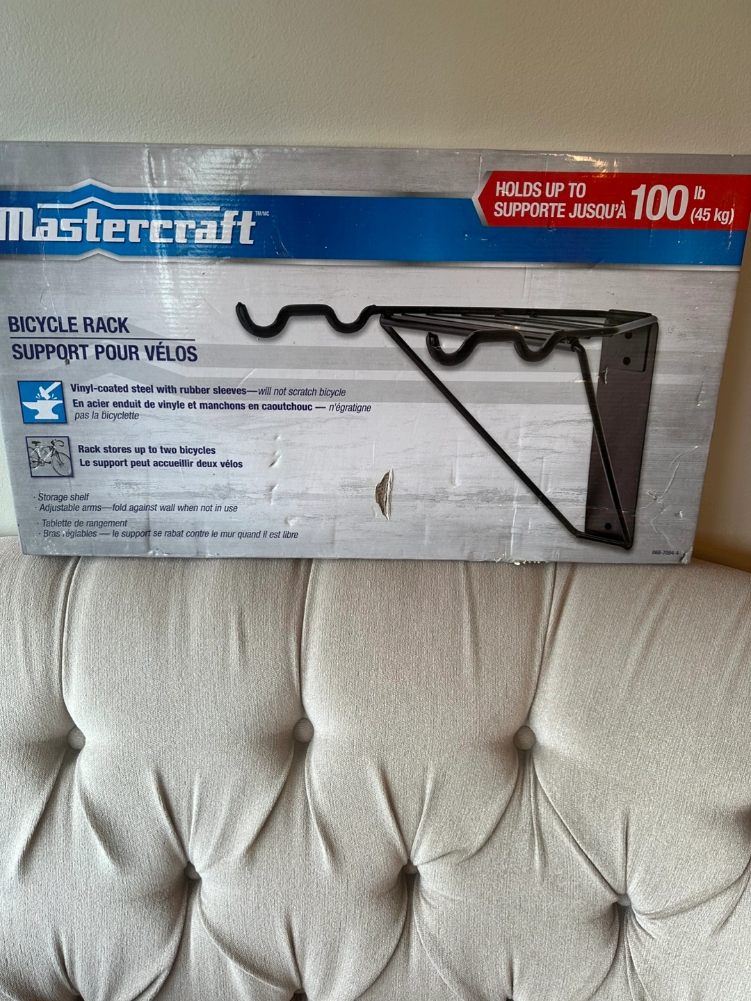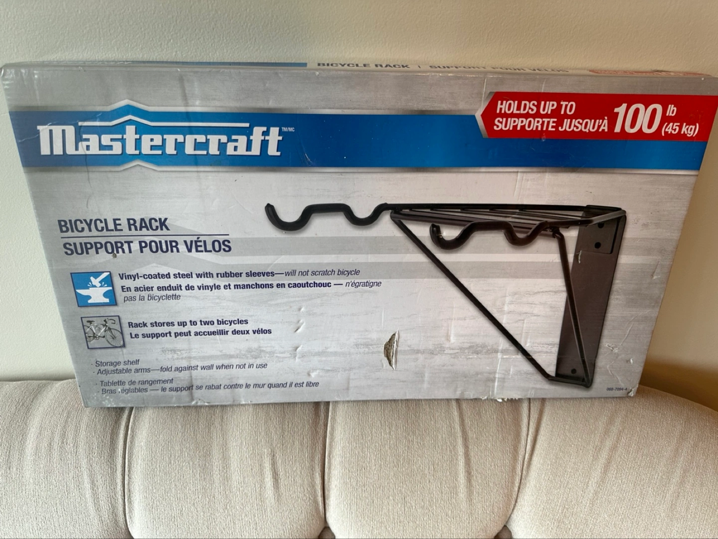 New in box. Vinyl-coated steel with rubber sleeves. Rack stores up to two bicycles. Adjustable arms. Folds against wall when not in use.