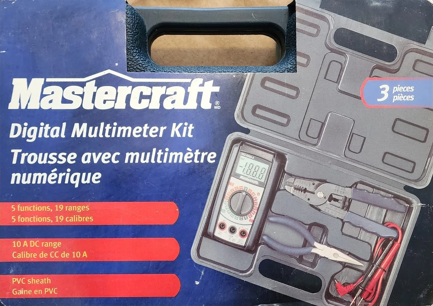 10Selling a Mastercraft digital multimeter kit! It includes 3 pieces and has 5 functions with 19 ranges. It also features a 10 A DC range and a PVC sheath.
