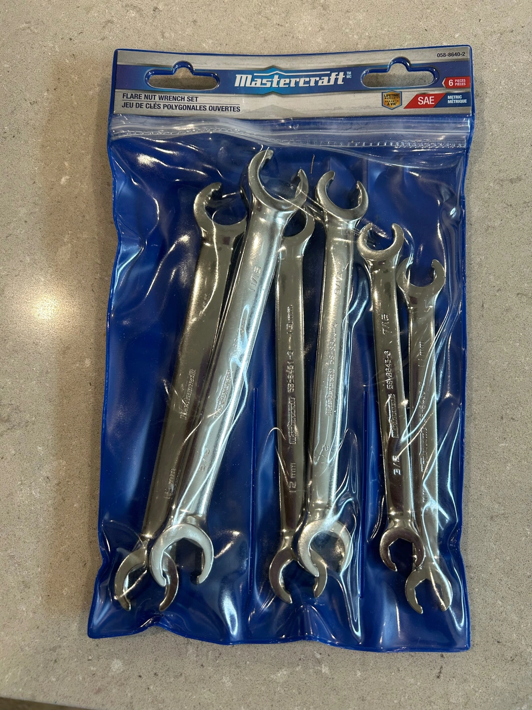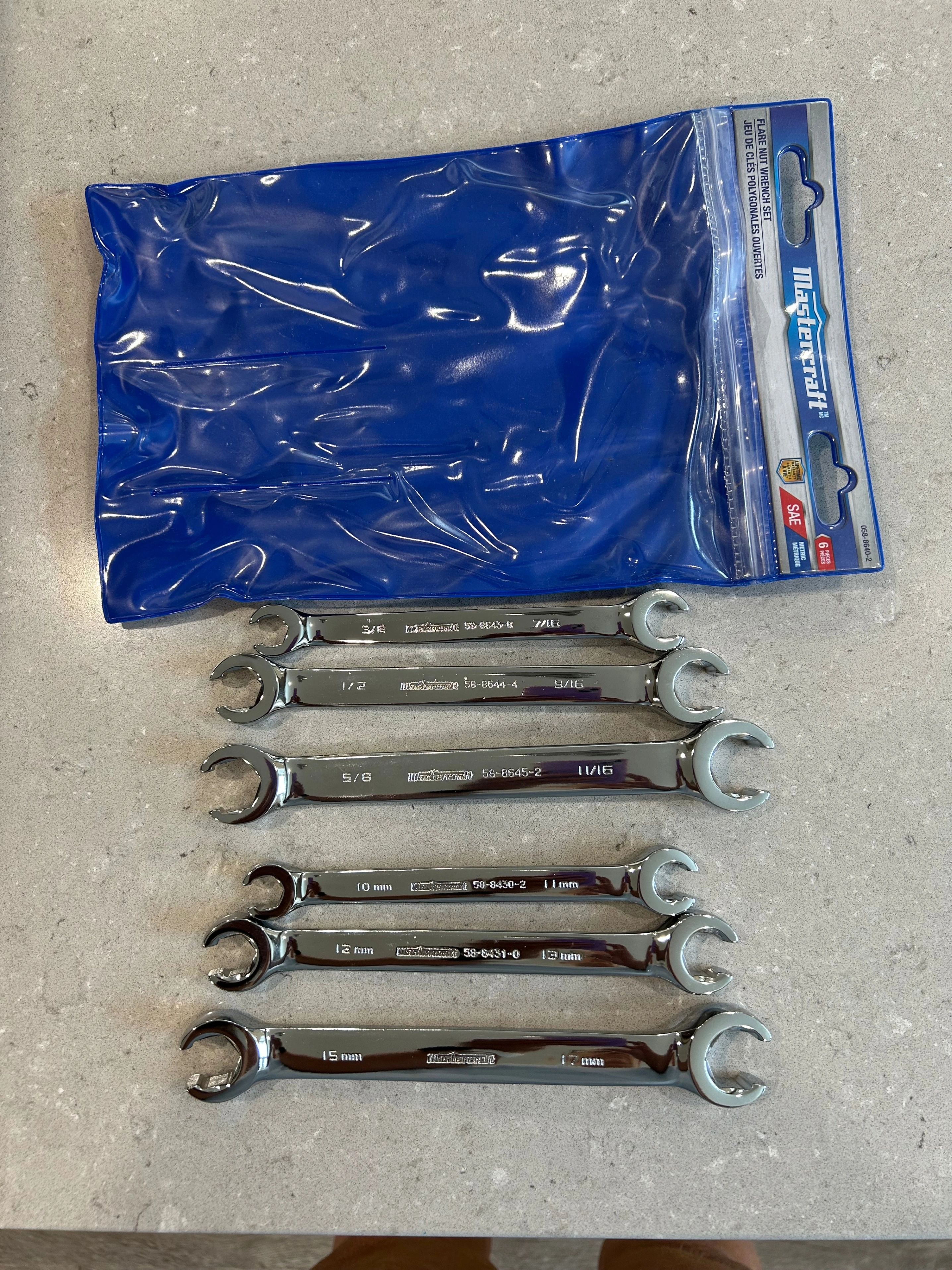 Mastercraft Flare Nut Wrench Set, SAE/Metric, Alloy Steel, 6-pc 3 wrenches with SAE sizes: 3/8" x 7/16", 1/2" x 9/16", 5/8" x 11/16" 3 wrenches with Metric sizes: 10mm x 11mm, 12mm x 13mm, 15mm x 17mm Compare to new at Canadian Tire $54.99 plus tax In original packaging never used! Pick up in Holland Landing or public meet at Rona East Gwillimbury CASH PLEASE NO eTRANSFER