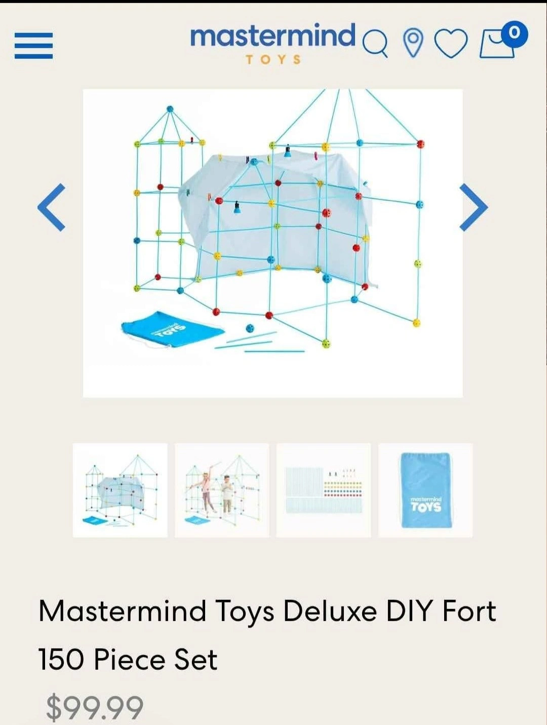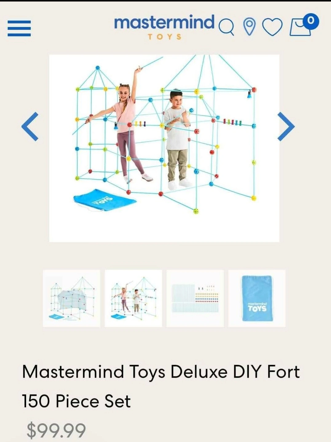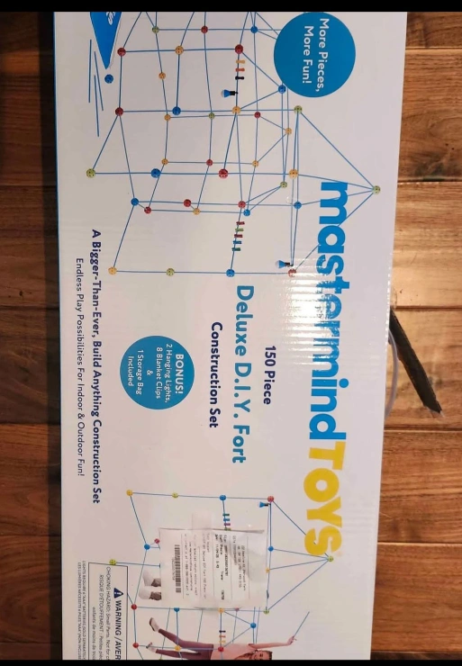 Get ready for endless fun with this Mastermind Toys Deluxe DIY Fort! This 150-piece set lets you build anything you can imagine, indoors or outdoors. It's a bigger-than-ever construction set that includes hanging lights, blanket clips, and a storage bag for easy cleanup. Originally bought for $99.99!