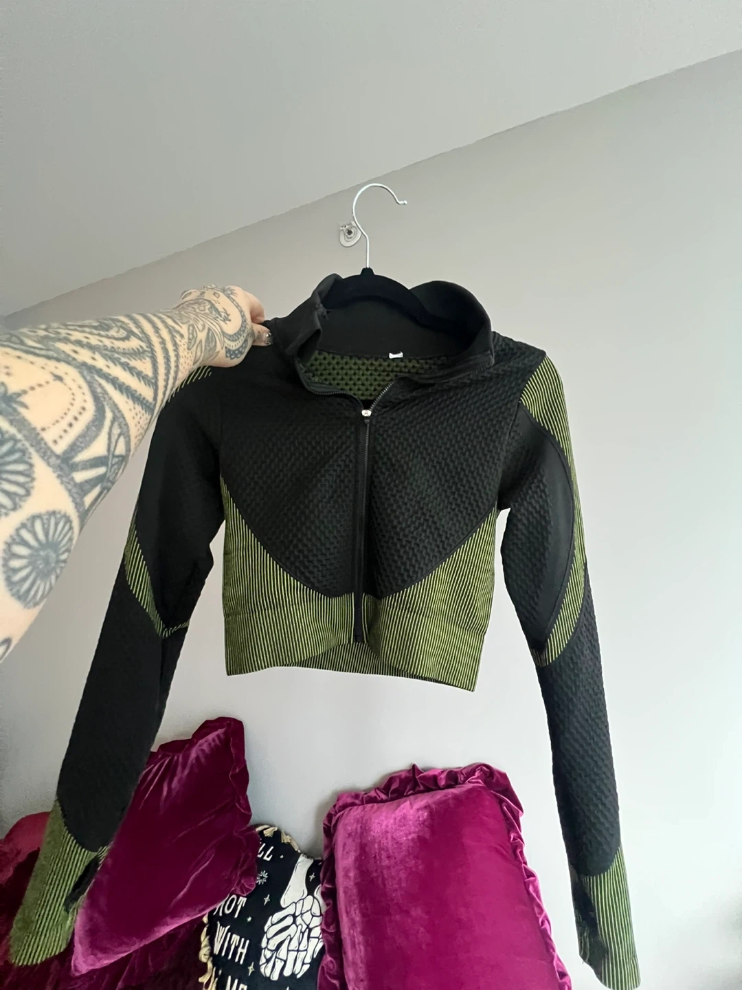86Selling a matching activewear set in olive green and black! The set includes leggings and a zip-up jacket. Great for workouts or just lounging around in style Size M stretches to a large L