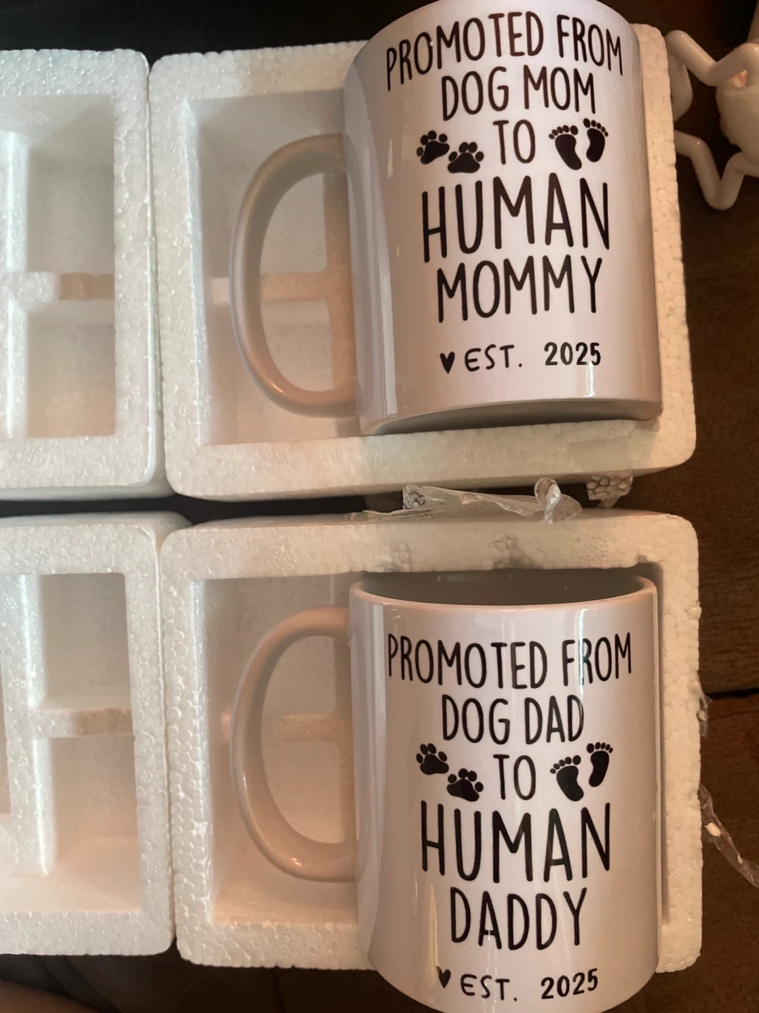 424I have a set of two brand new mugs, perfect for expecting parents who are also dog lovers! One mug says "Promoted from Dog Mom to Human Mommy, EST. 2025," and the other says "Promoted from Dog Dad to Human Daddy, EST. 2025" Both come in their original packaging