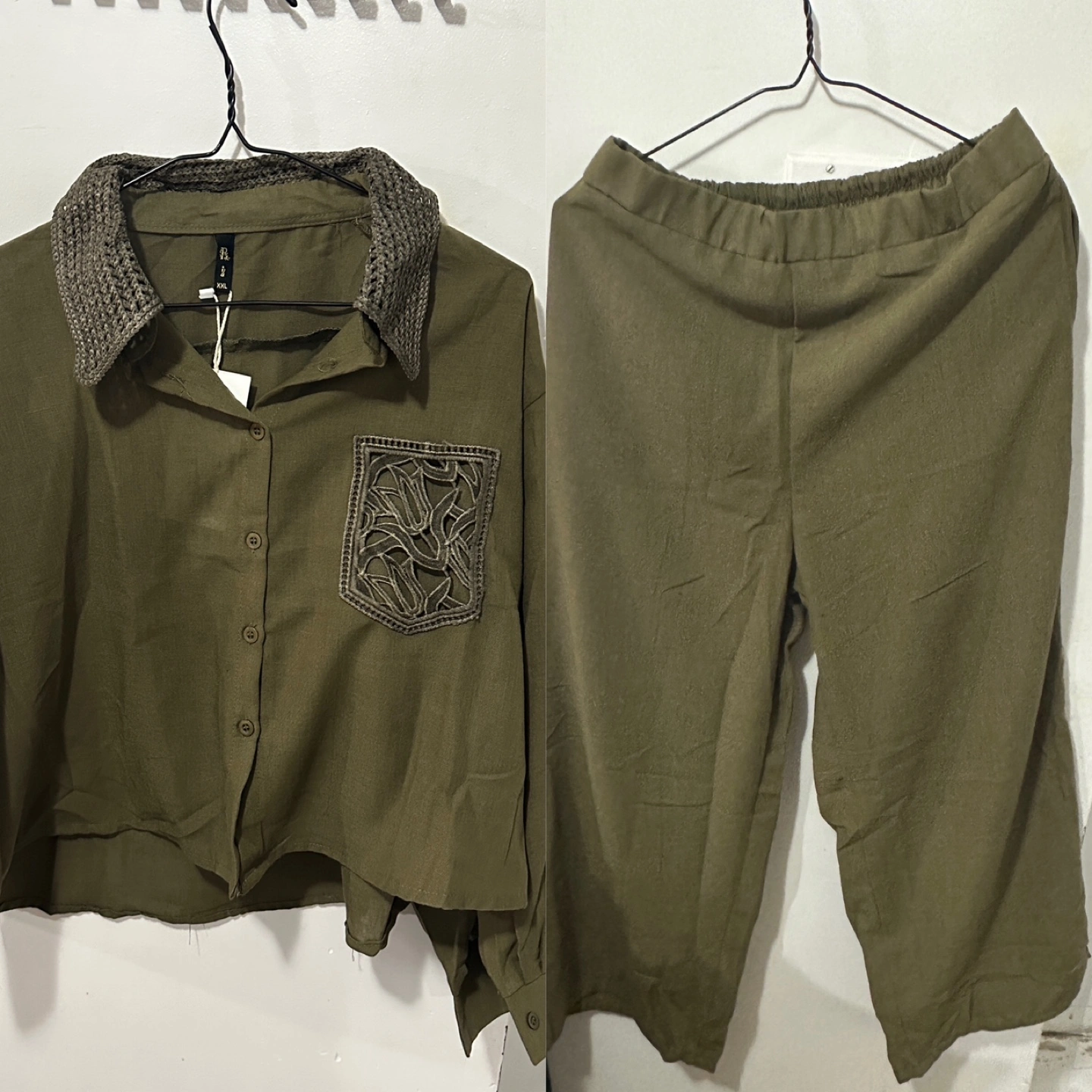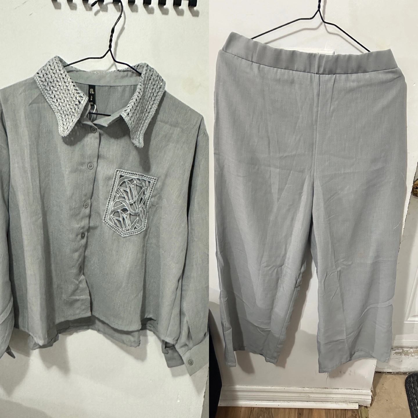 Button-up shirt with a decorative collar and pocket. Cropped fit. Wide-leg pants with elastic waist. A perfect set for lounging around on a lazy day.