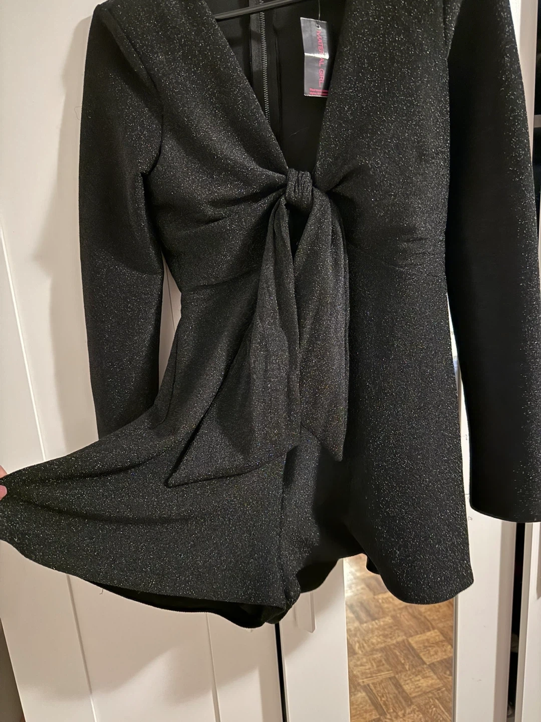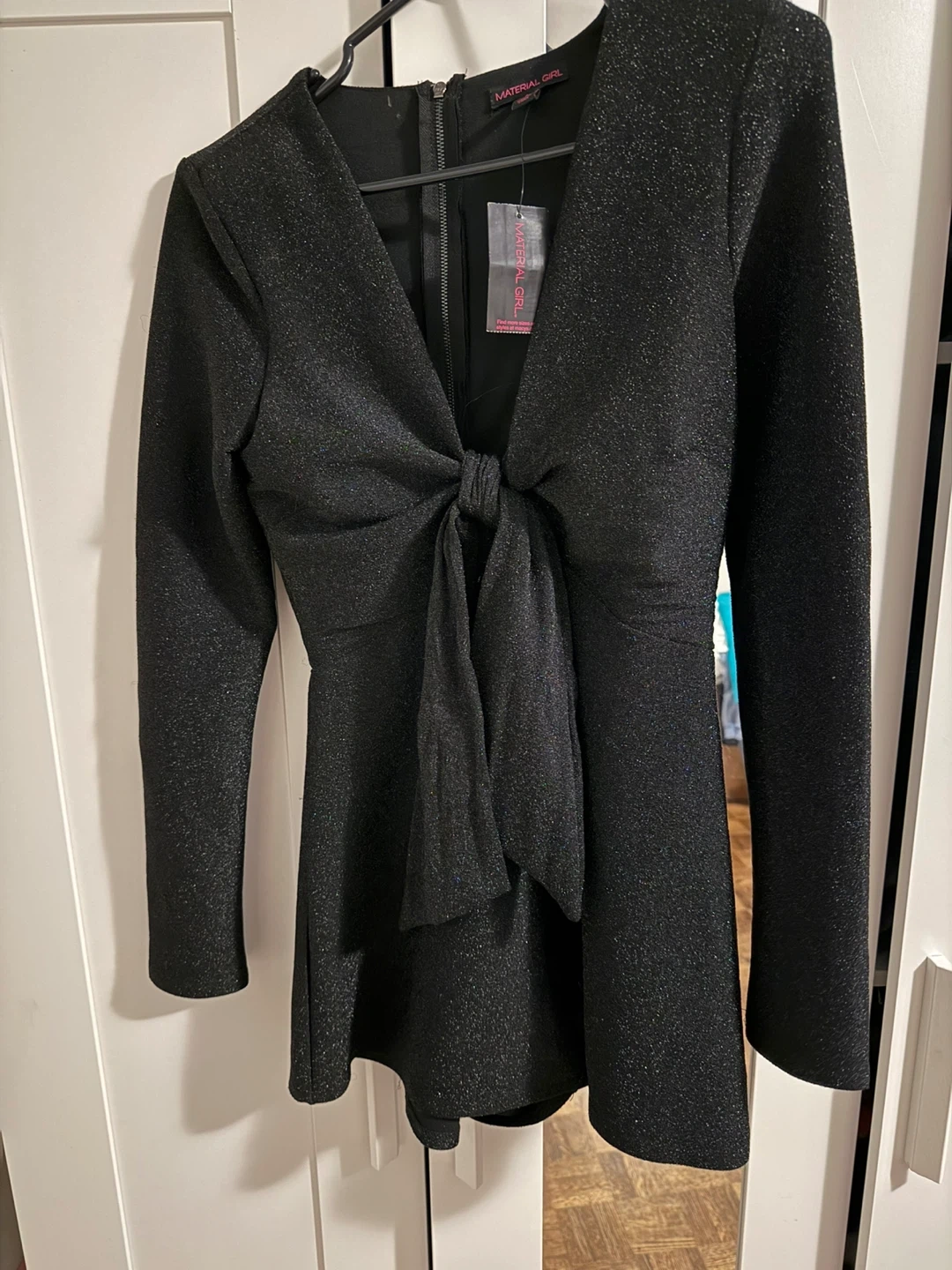 Selling a Material Girl black romper in size medium! It's a stylish piece with a unique tie-front design. Perfect for a night out or a special occasion