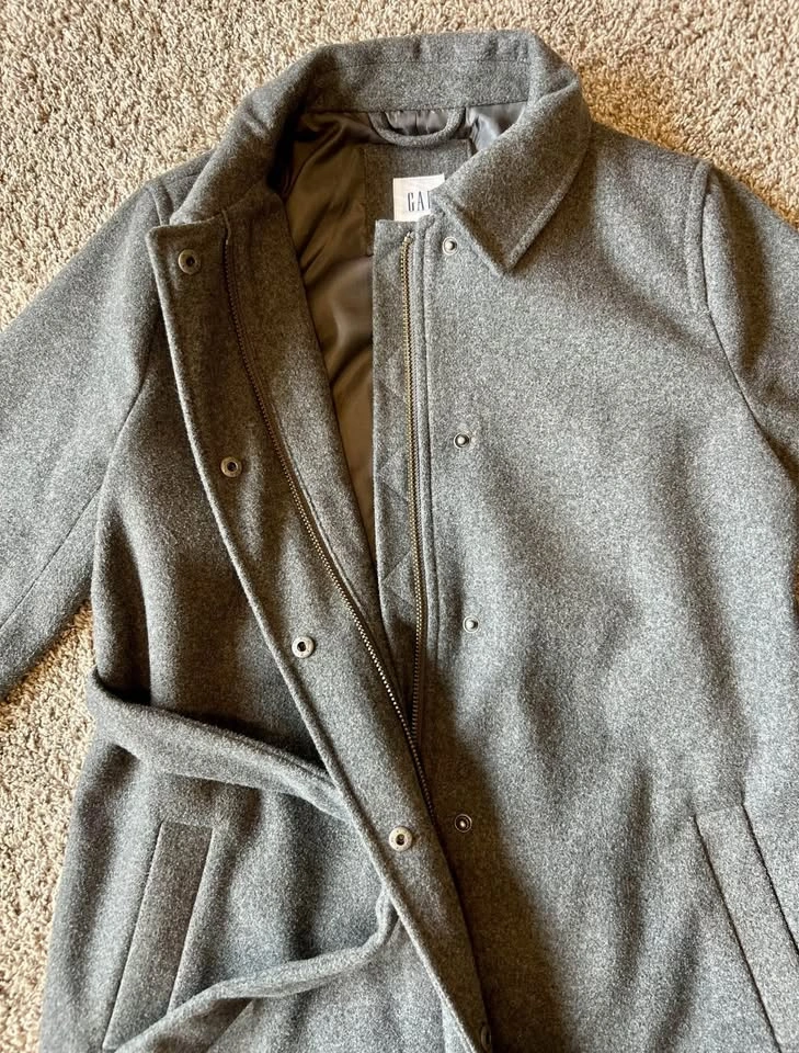 Excellent condition Gap Maternity wool coat. Full length zipper with snaps to keep you even warmer. Has pockets. Waist tie makes the bump super cute.