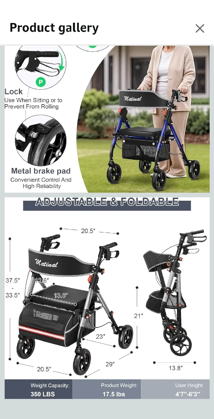 60This Matinal walker is both adjustable and foldable, making it easy to store and transport! It features a safe and reliable brake system, ensuring stability when you need it. The walker also has a seat, so you can rest when needed. It has double storage space and detachable storage bag!