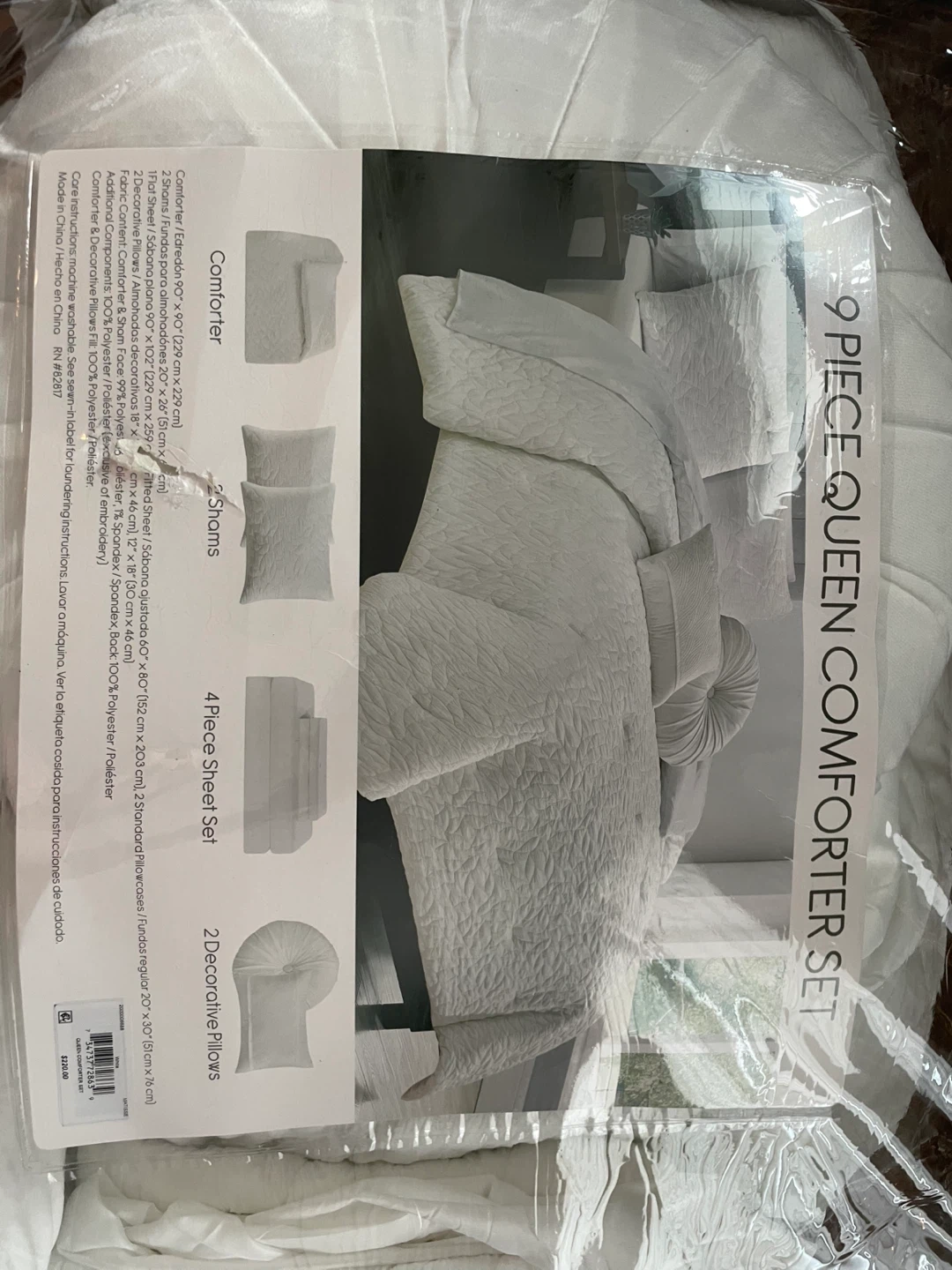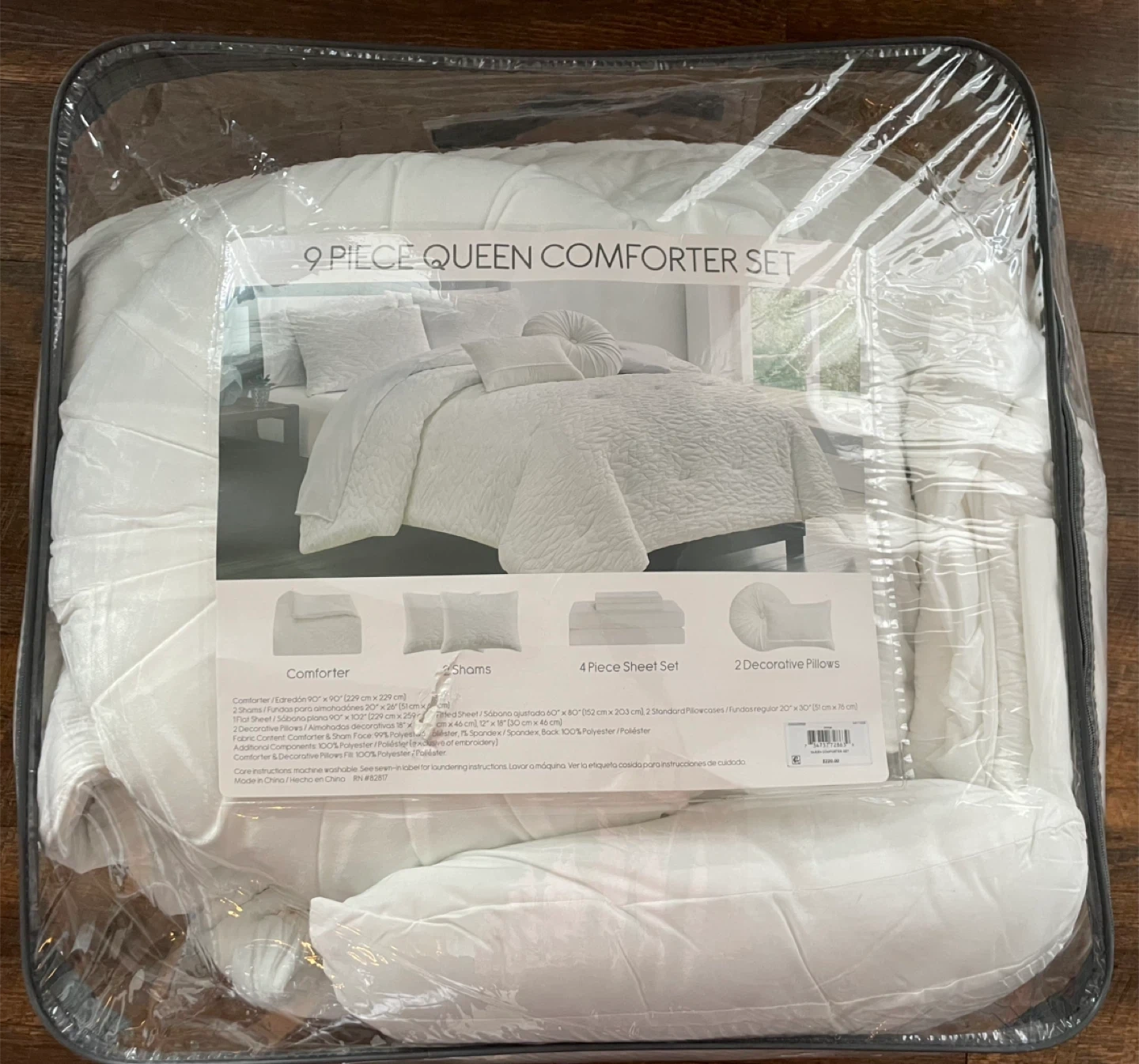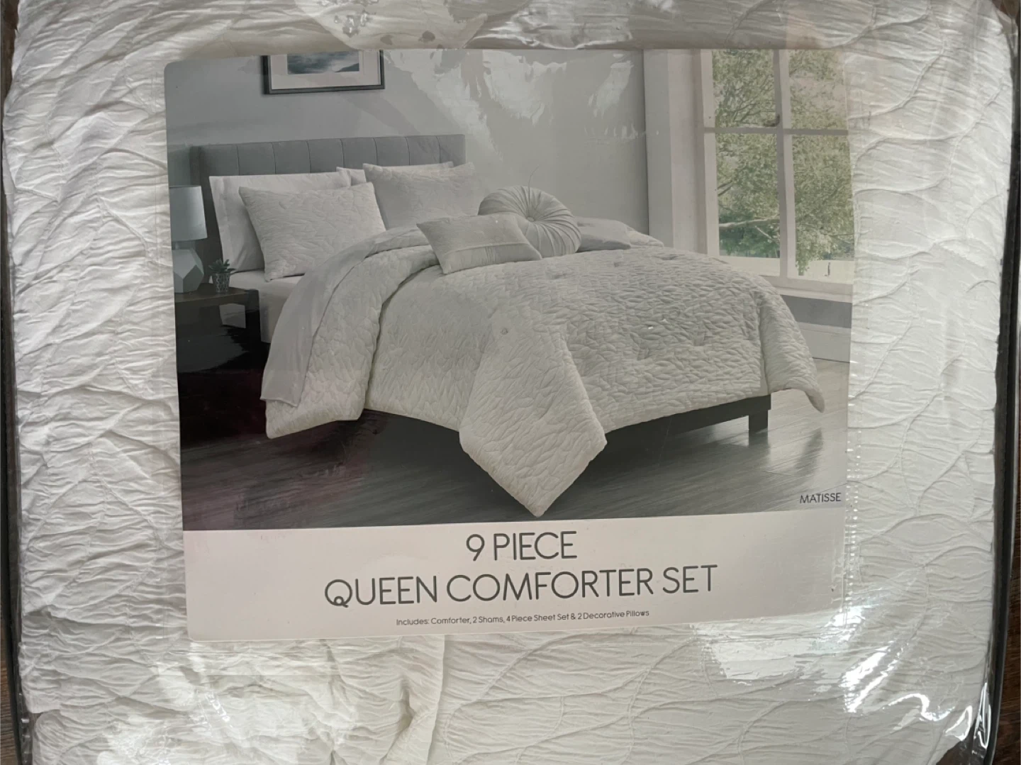 Selling a brand new, still-in-packaging Matisse 9-piece queen comforter set! This set includes the comforter, two shams, a 4-piece sheet set, and two decorative pillows. It's a complete bedding solution to refresh your bedroom. Everything is 100% polyester for easy care and lasting comfort