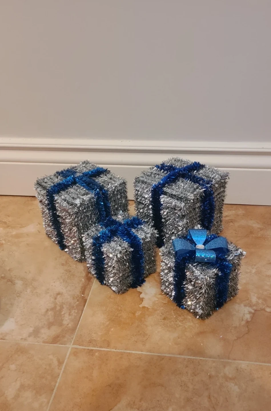 This is a set of four decorative tinsel gift boxes. They're covered in silver tinsel with blue striped accents and a blue bow on one. Perfect for holiday or general gift wrapping flair!