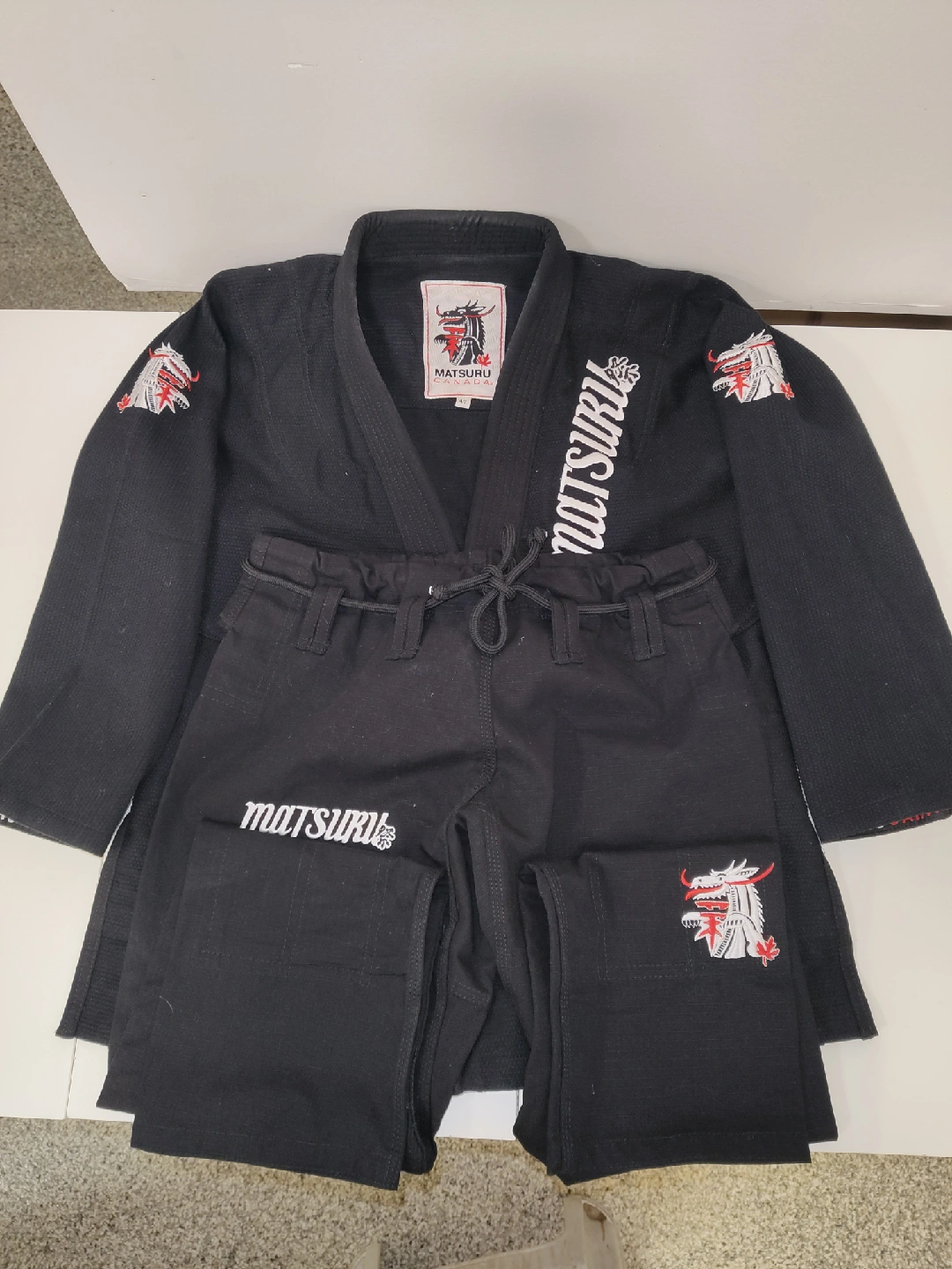 69Selling a black Matsuru BJJ Gi in size 40. It's in great condition and ready for a new home. Features the Matsuru logo and dragon design. Perfect for anyone looking to get into Brazilian Jiu-Jitsu or needs a spare gi!