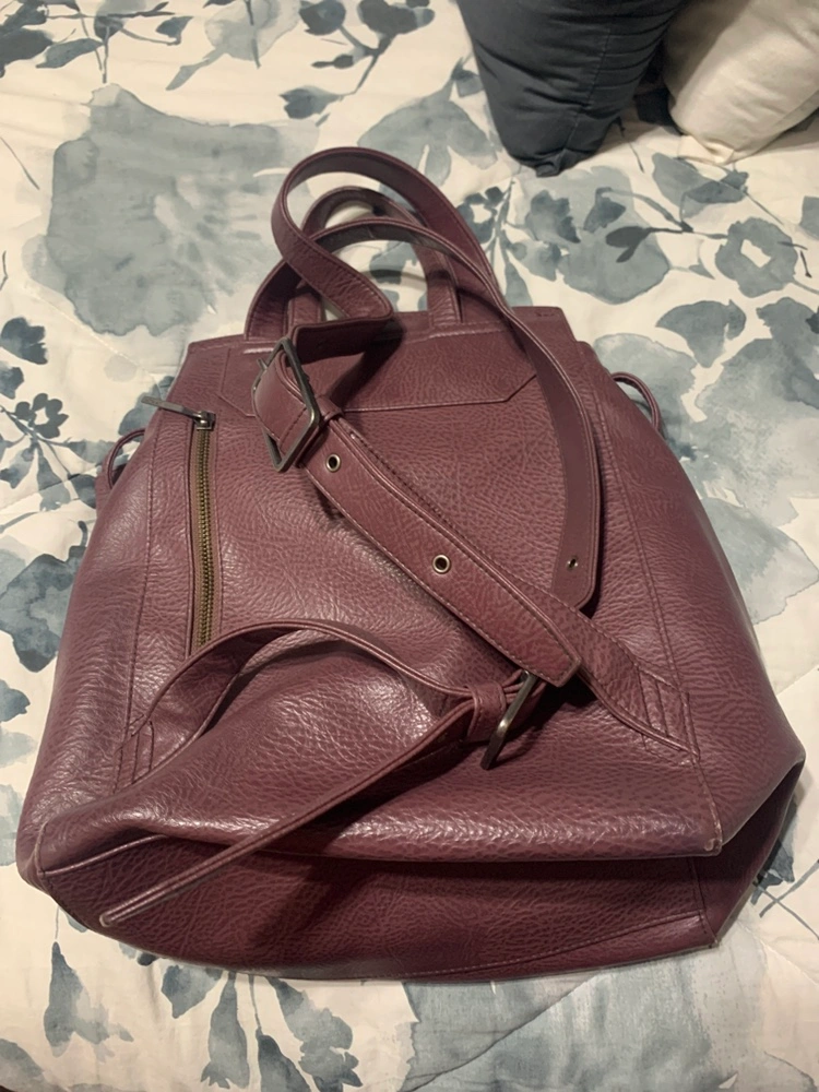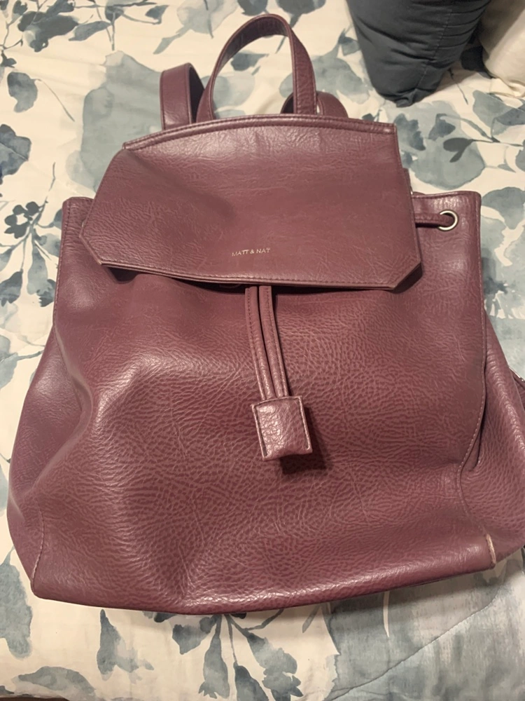 67Burgundy backpack with a drawstring closure, adjustable straps and a front pocket.