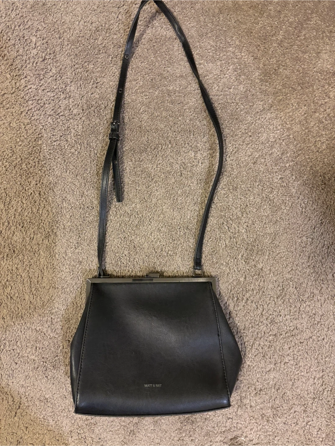 25Selling a stylish black crossbody bag from Matt & Nat! It's in great condition and perfect for everyday use. The bag features a sleek design with a convenient adjustable strap and interior pockets to keep your essentials organized. The material is vegan leather, making it a great choice for those looking for cruelty-free options