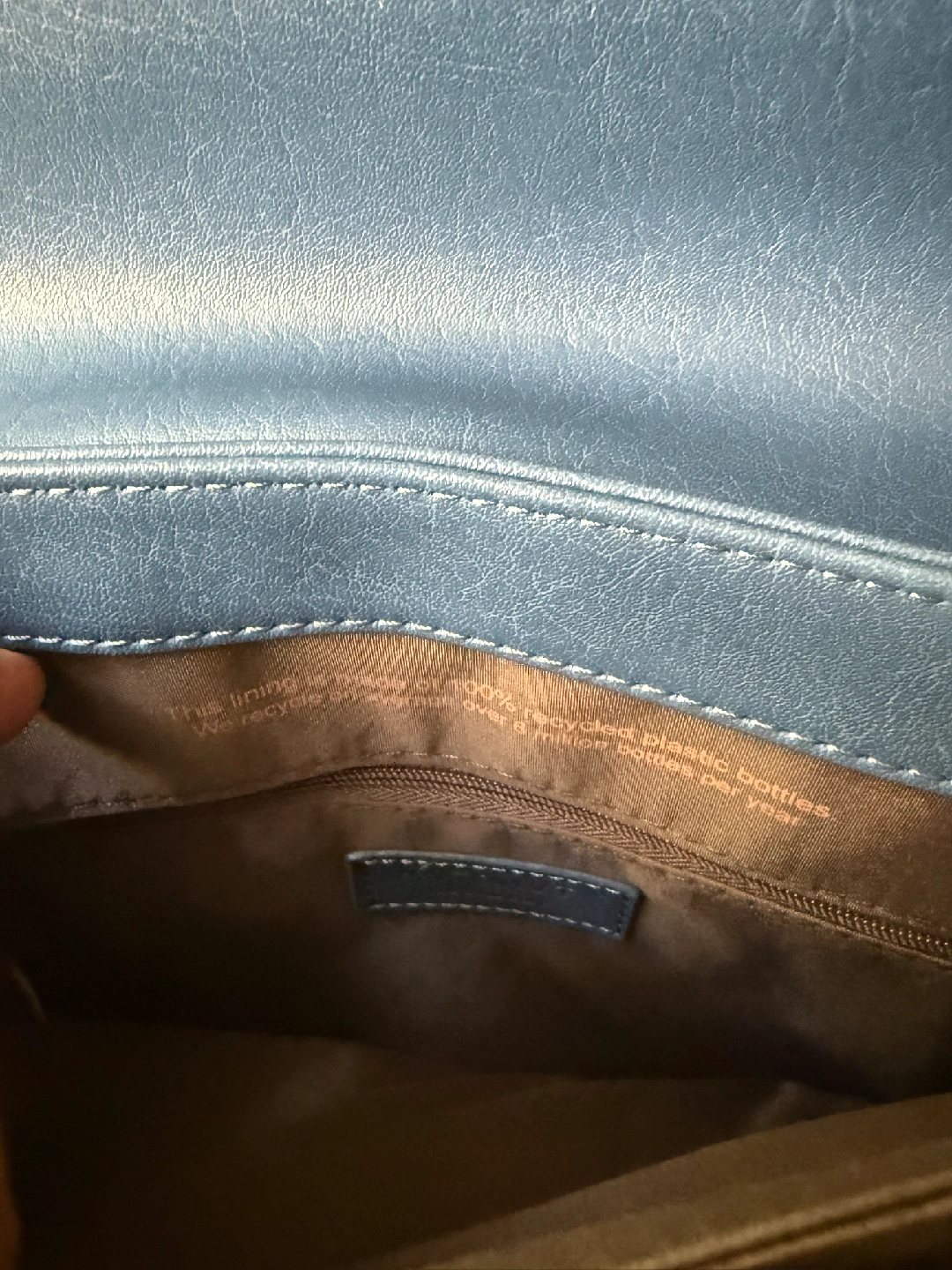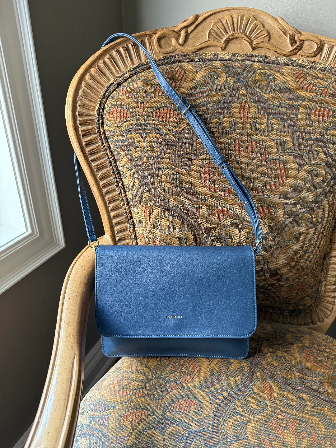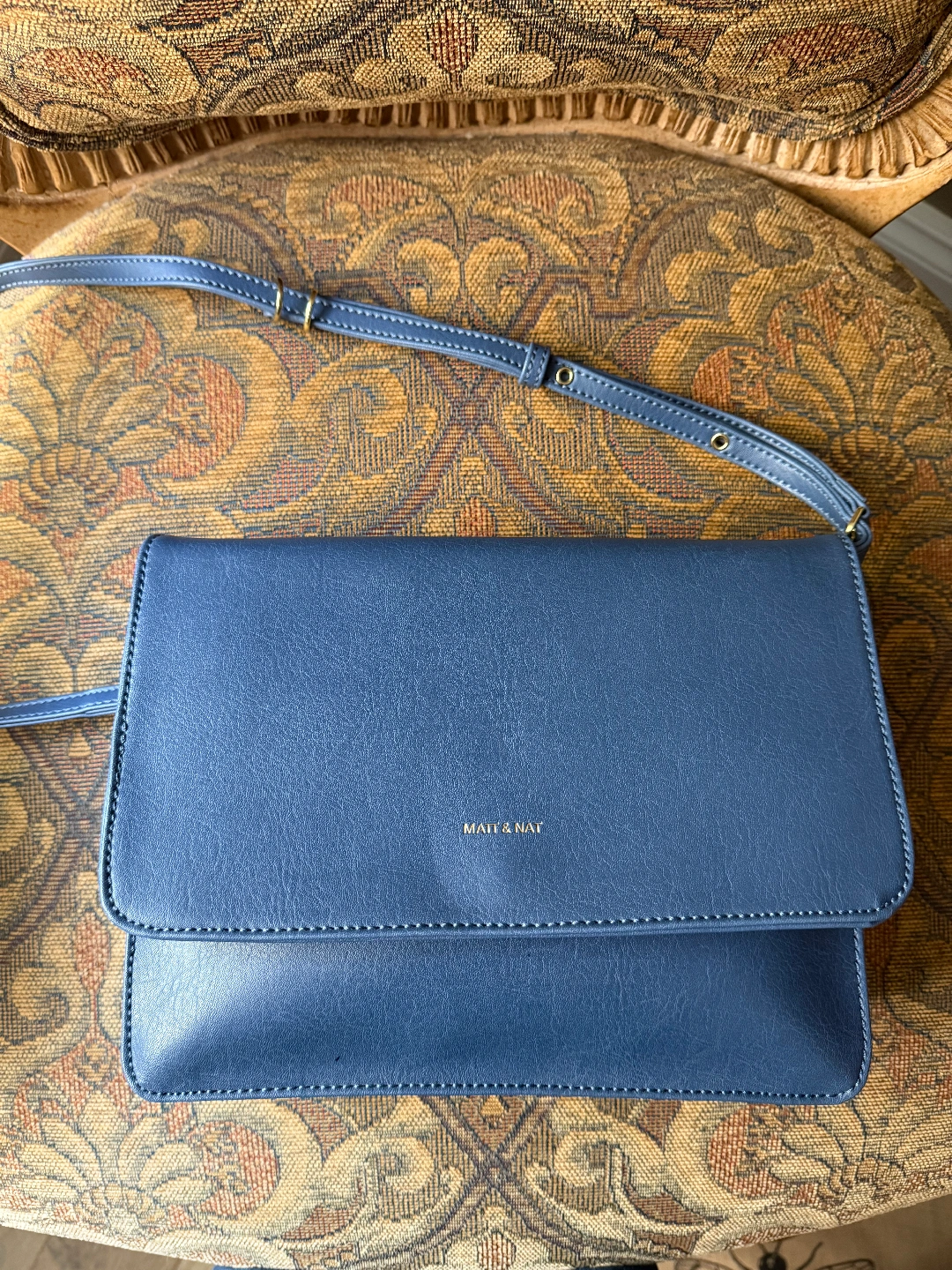 A stylish blue crossbody bag from Matt & Nat! This bag features a sleek design and is perfect for carrying your essentials. The lining is made from 100% recycled plastic bottles, making it an eco-friendly choice. It's in new condition and ready for a new home!