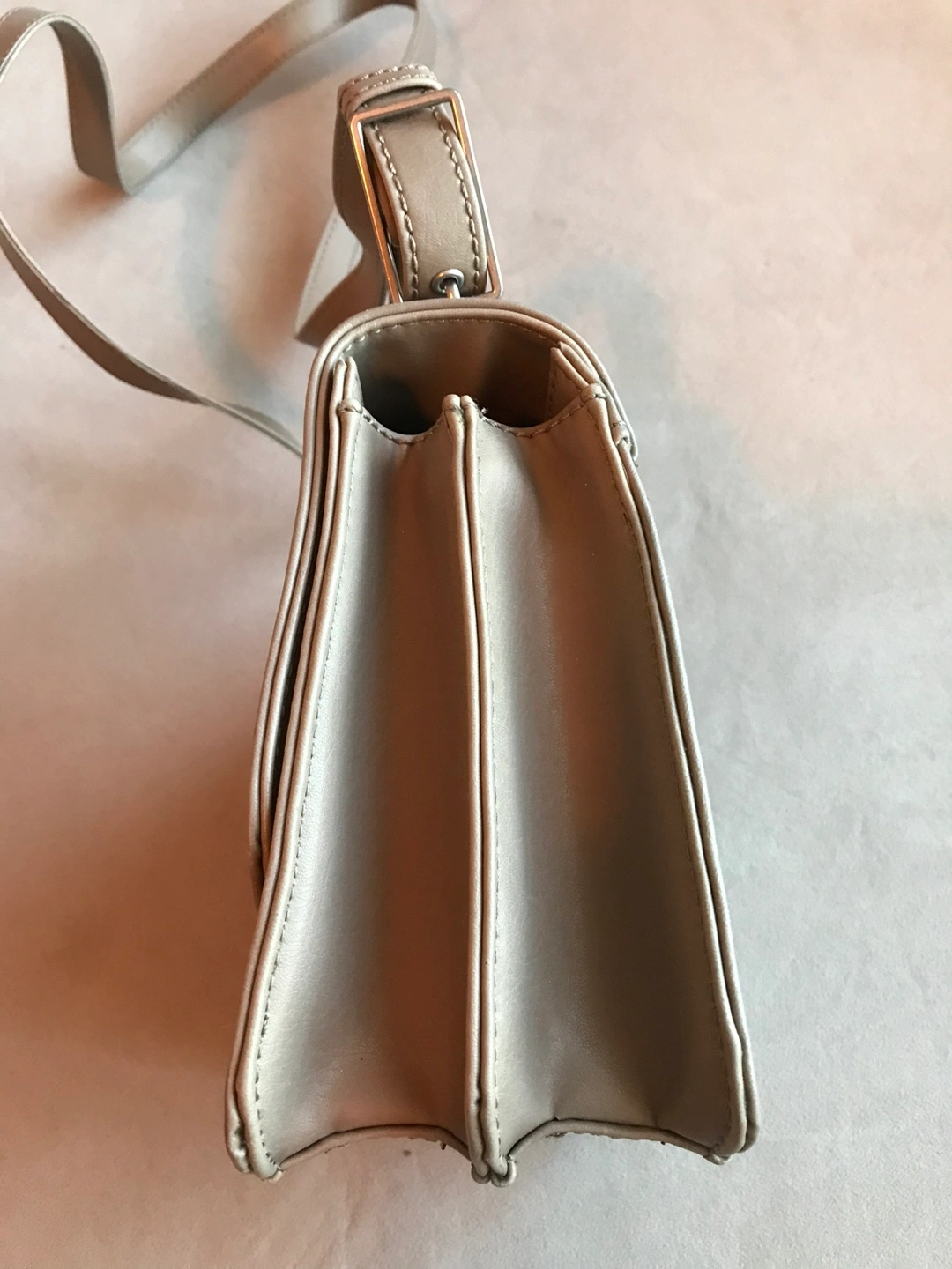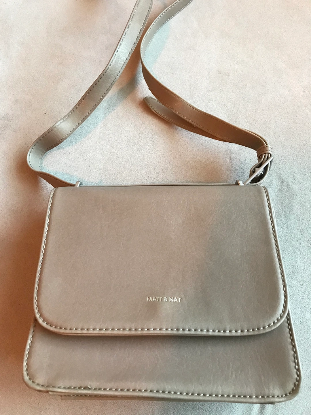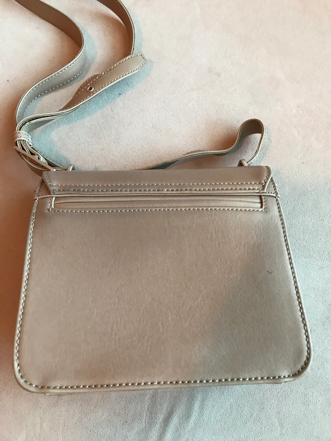 Small crossbody bag with adjustable strap. Beige. Vegan leather All sales final. Curbside pick-up Woodbine and Gerrard